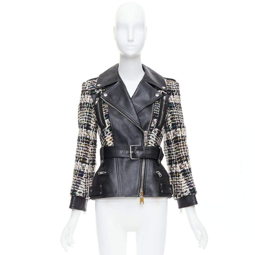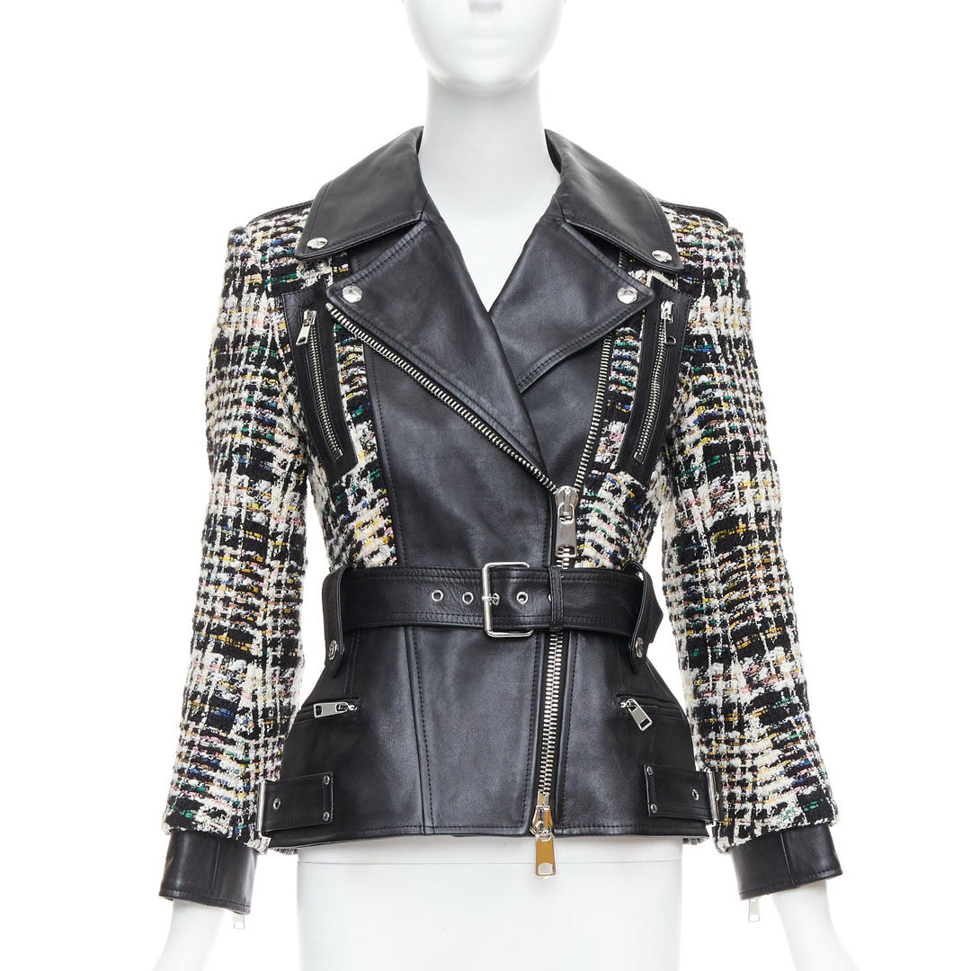 ALEXANDER MCQUEEN 2023 Hybrid punk black leather tweed biker jacket IT36 XXS