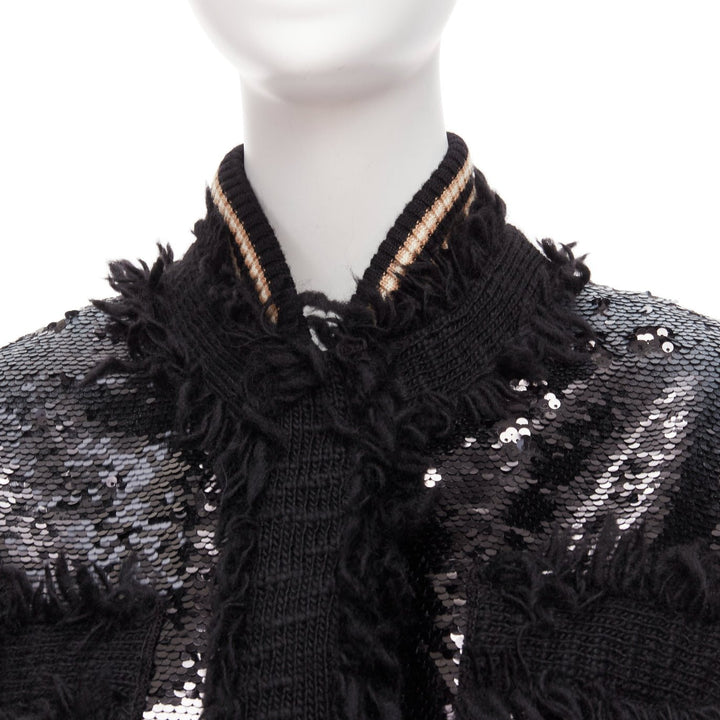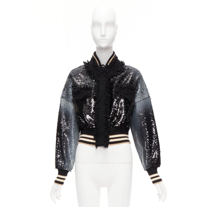 Extra Details: White spray paint effect on sequins. Varsity bomber silhouette. Black wool fringe trim along collar. Snap button closure.