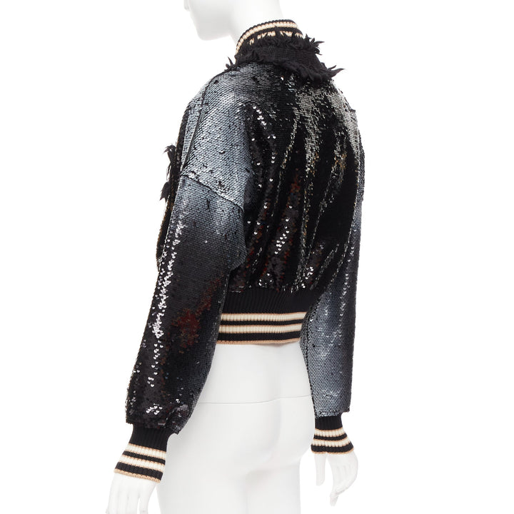 AVIU black white spray paint effect sequins cropped bomber jacket IT38