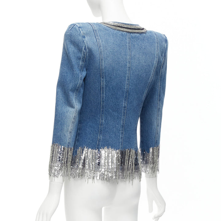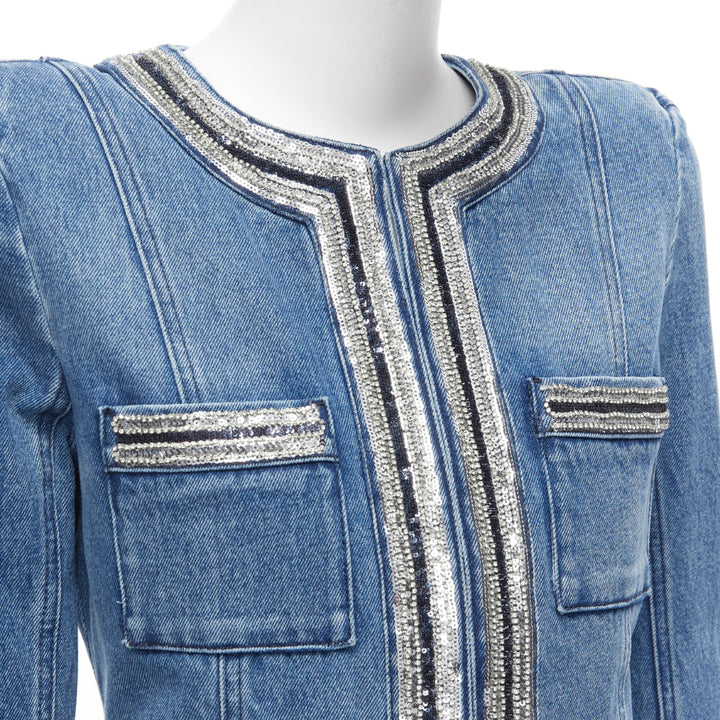 BALMAIN blue washed cotton denim silver crystal embellished trim jacket FR36 S