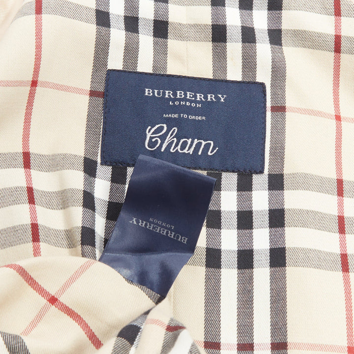 Extra Details: With name "Cham" embroidered on tag. Classic Burberry house check lining. Horn buttons. Belted.