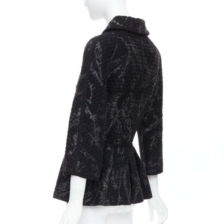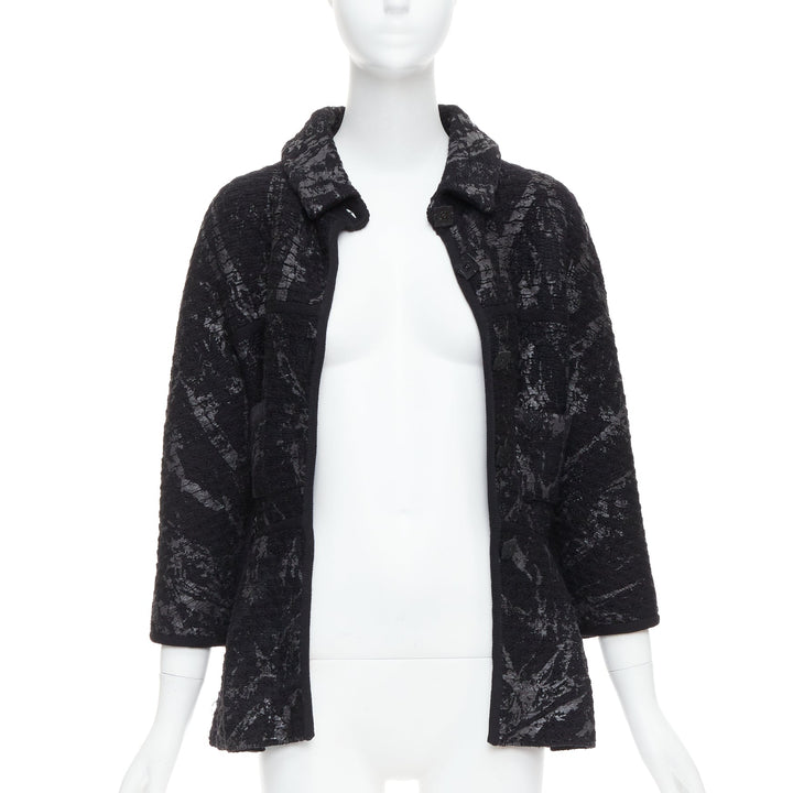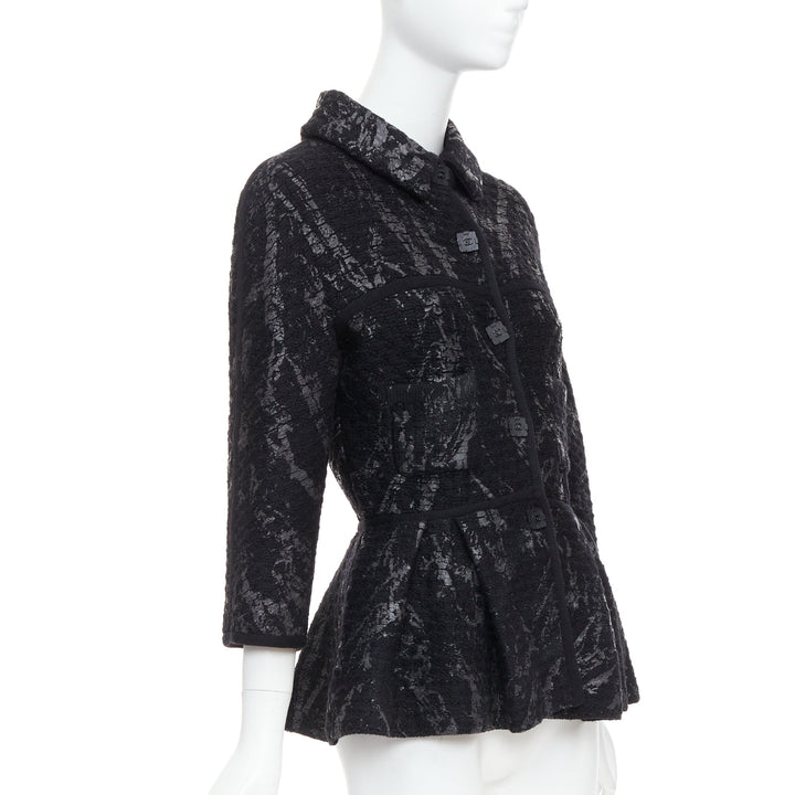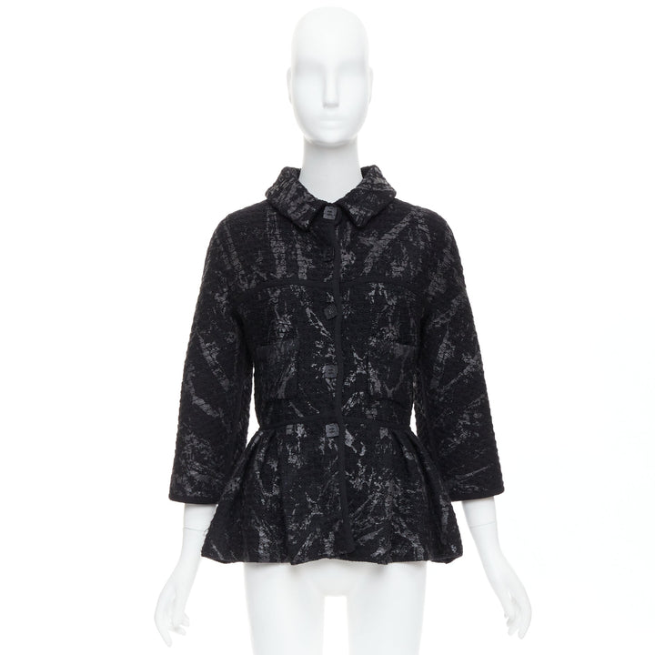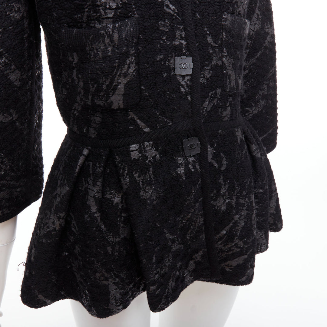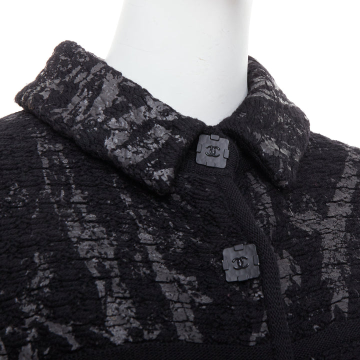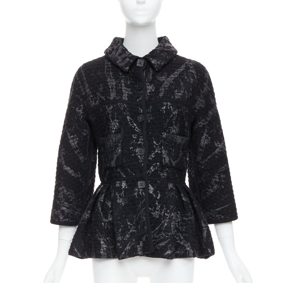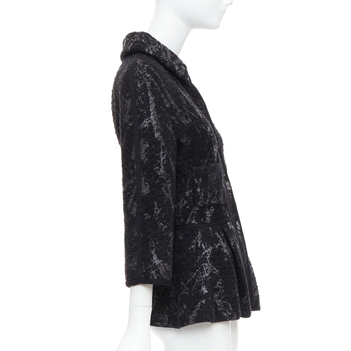Extra Details: From 2011 Fall Metallic Fantasy Collection. Black stretchy chunky wool basket knit in black. Gunmetal iridescent splash paint coating print allover. Collared. Front button closure with black square CC buttons. Long one piece dolman sleeves. Patch pockets. Pleated waist with short peplum.