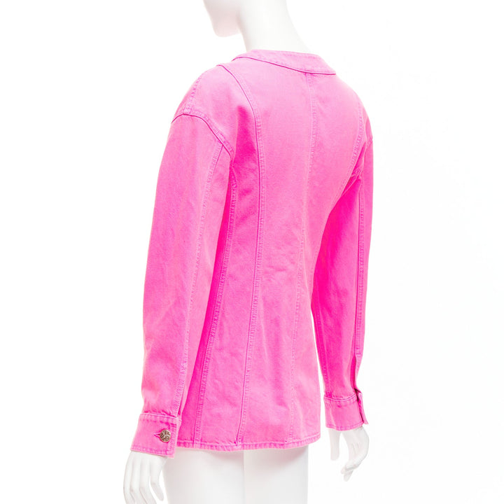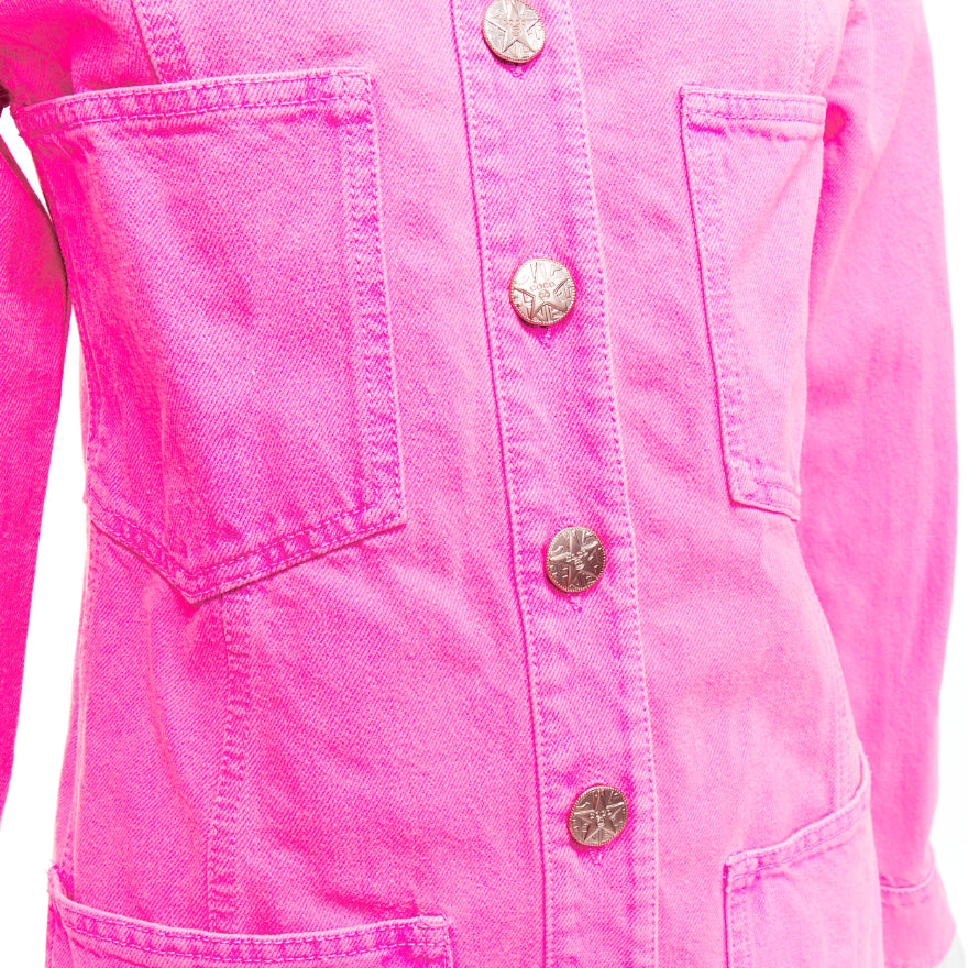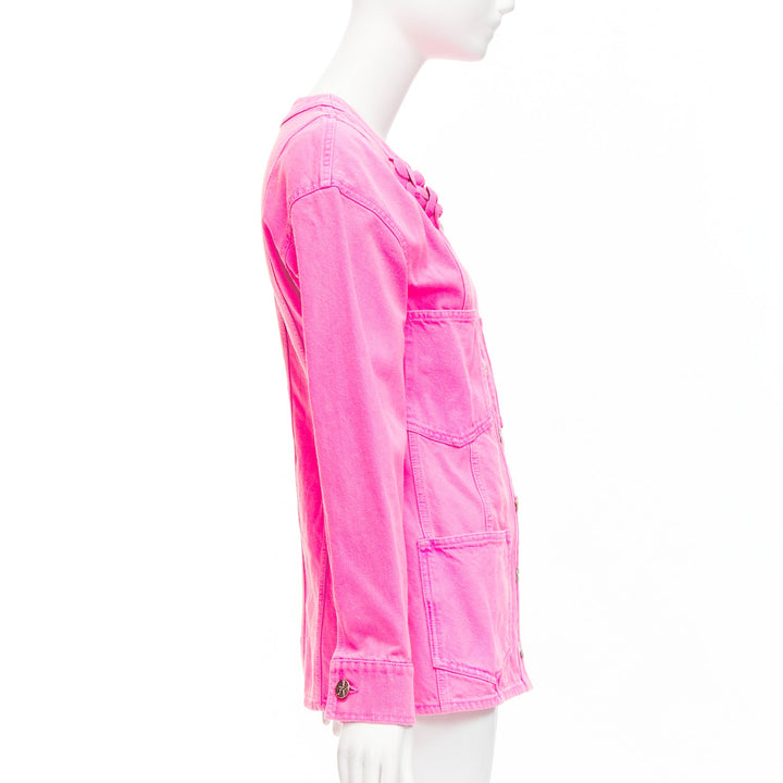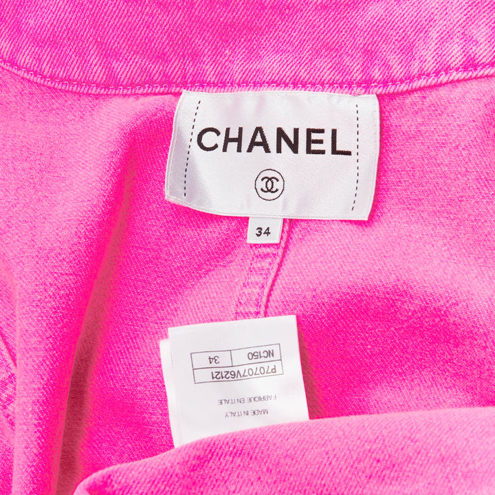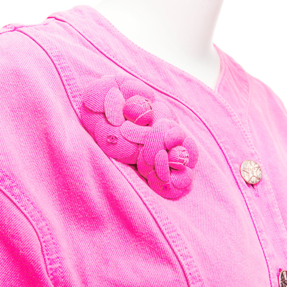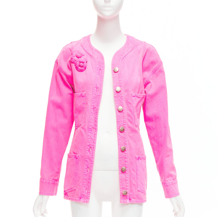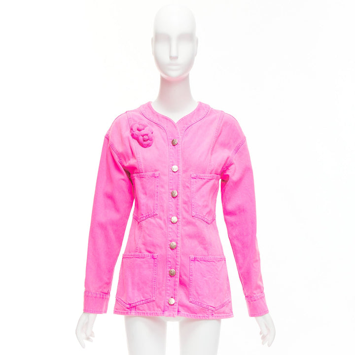 CHANEL 2021 neon pink cotton denim CC logo camellia embellished jacket FR34 XS