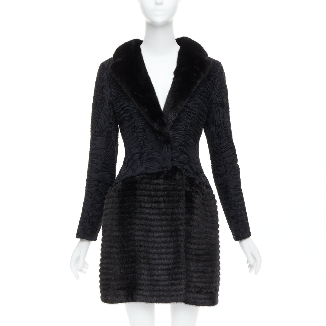 CHRISTIAN DIOR black lamb mink fur silk lined long coat FR38 M