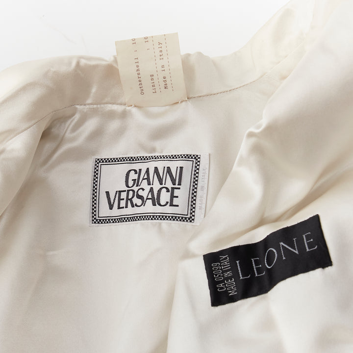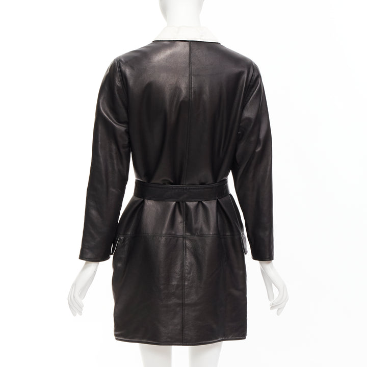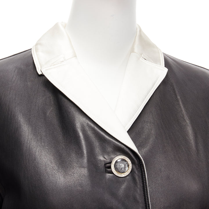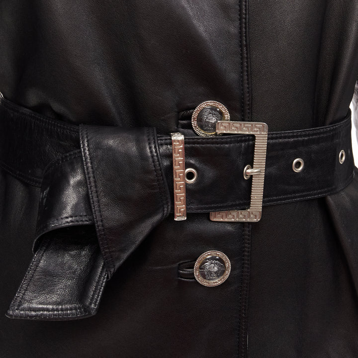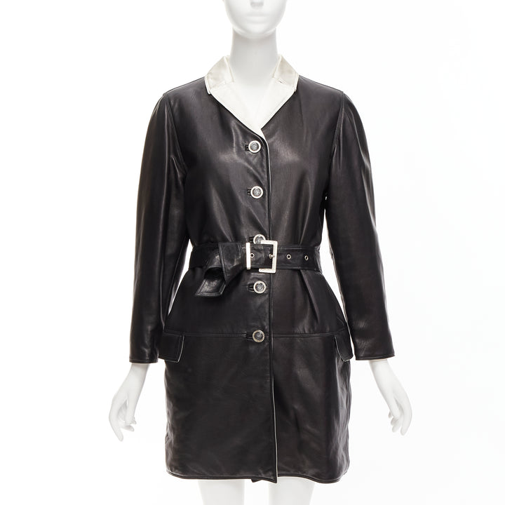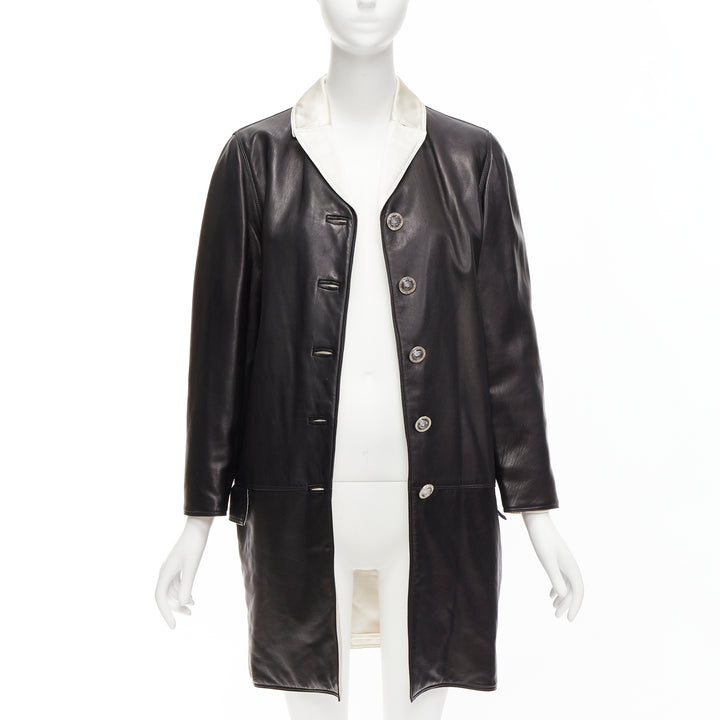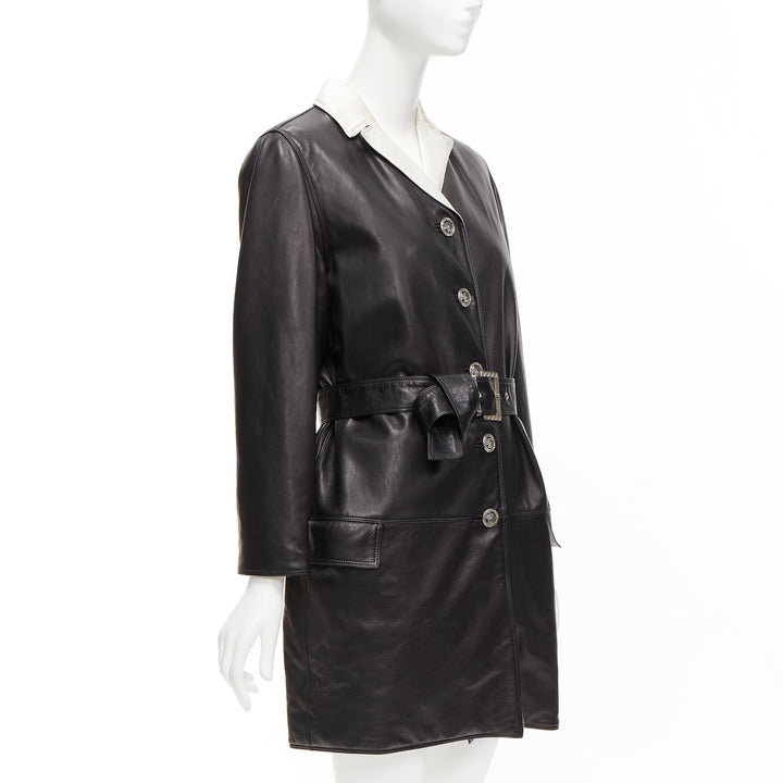 GIANNI VERSACE Vintage black leather white silk medusa button belted coat