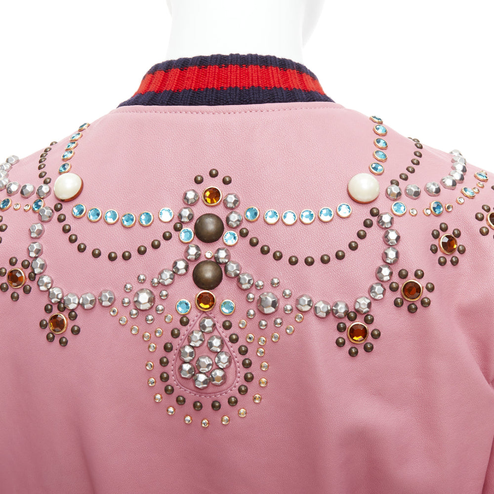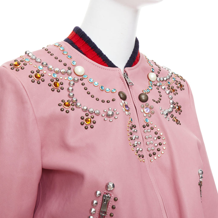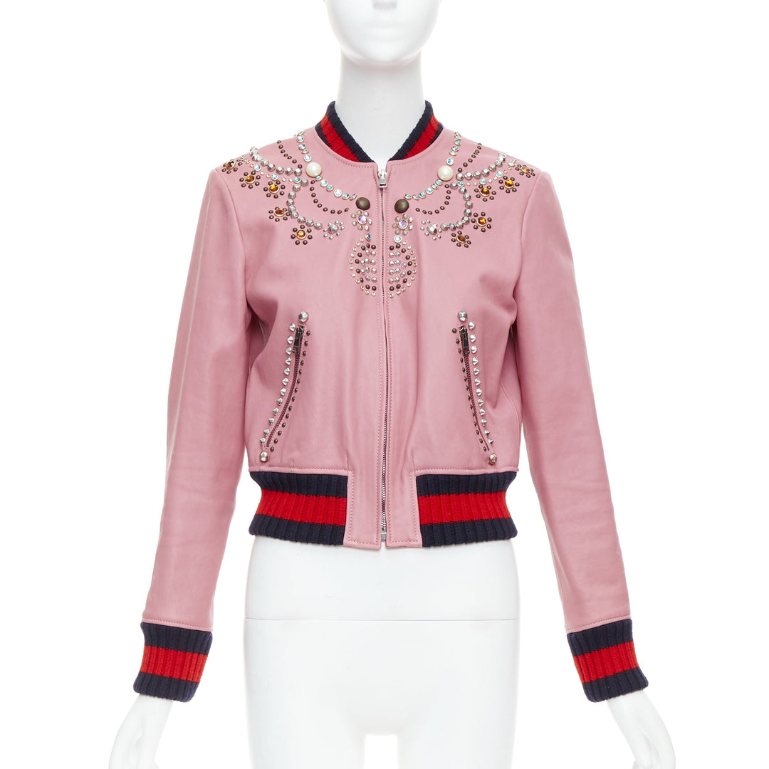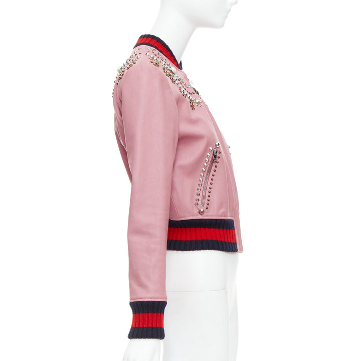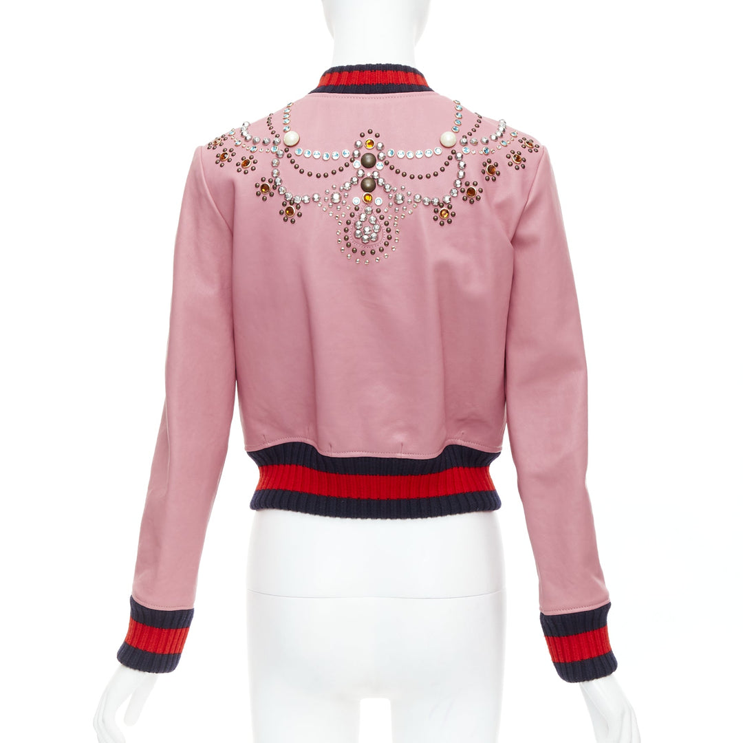 GUCCI pink lambskin pearl embellished web trim crop bomber IT40 S