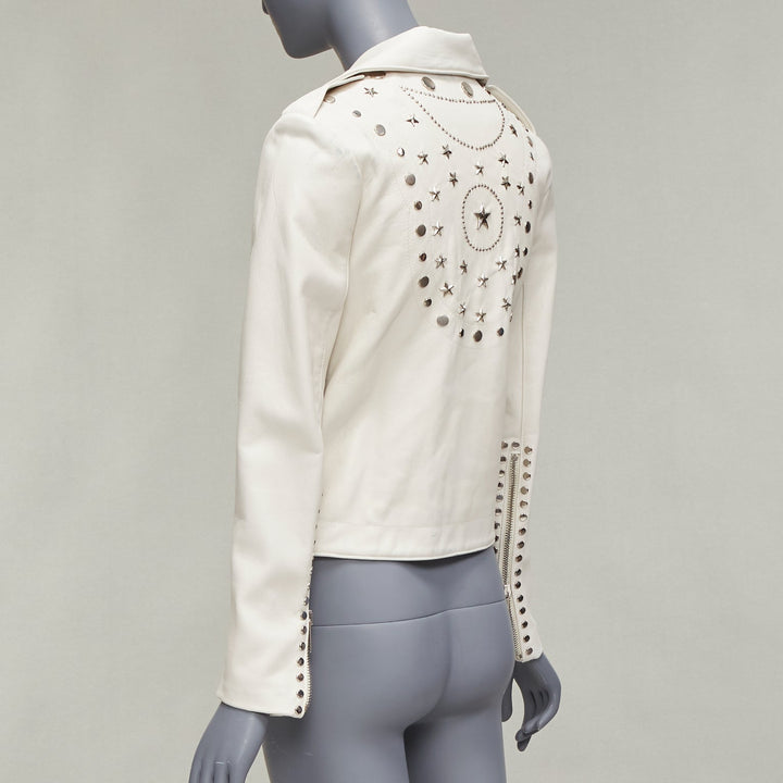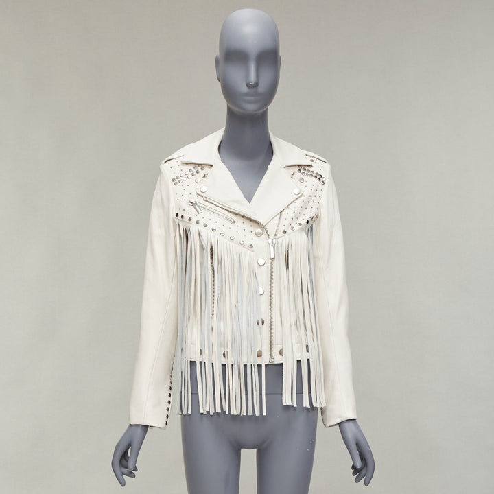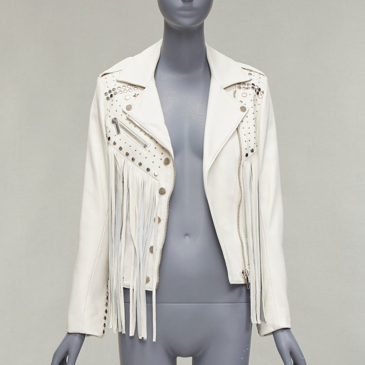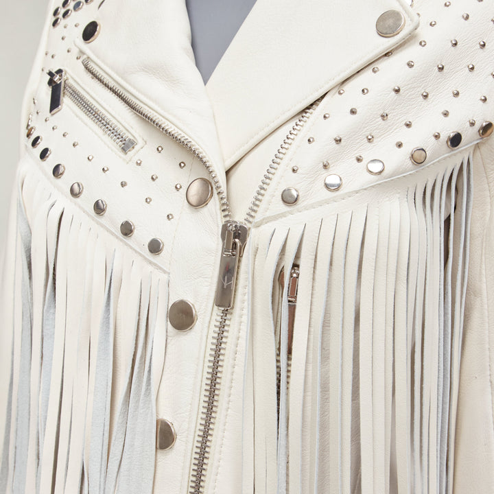 NOUR HAMMOUR cream lambskin fringe silver studs western biker jacket FR34 XS