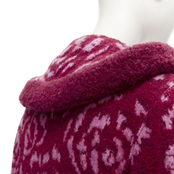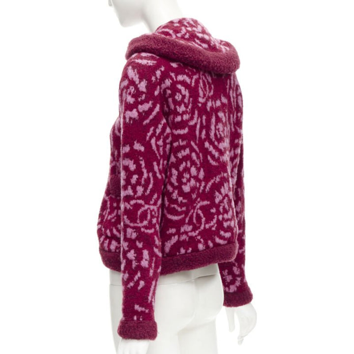 rare CHANEL red pink Camellia CC wool fluffy boucle trim cardigan jacket FR34 XS