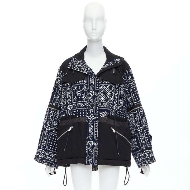 Extra Details: Sacai Reyn Spooner Jacket In signature Chitose Abe style, this zip-front jacket never bores, boasting a series of zip and flap details which allow the wearer to tweak the silhouette with their mood. The piece features a bandana-like print, a genius collab between the designer and Reyn Spooner, a Hawaiian shirt company. Stand collar with attached hood. Long sleeves. Concealed front zip closure. Front snap flap and zip pockets. Lined.
