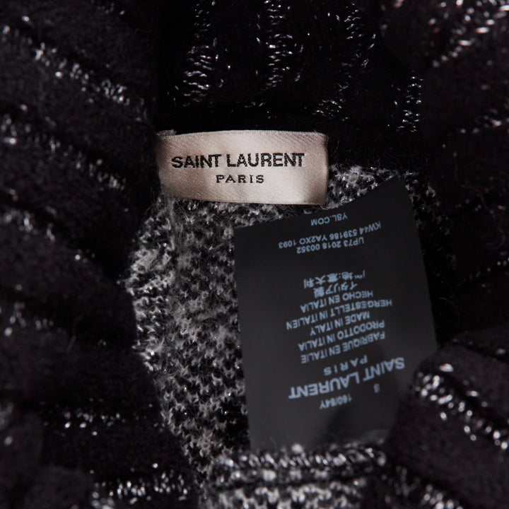 Extra Details: Saint Laurent fuses expert craftsmanship with the label’s signature rock ‘n’ roll flair. Crafted in Italy, this black and white mohair-wool blend Constellation knitted poncho from Saint Laurent features a turtleneck, long sleeves, a loose fit, an asymmetric hem and a constellation design.
