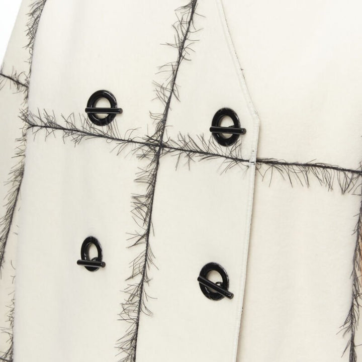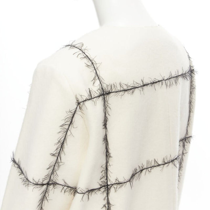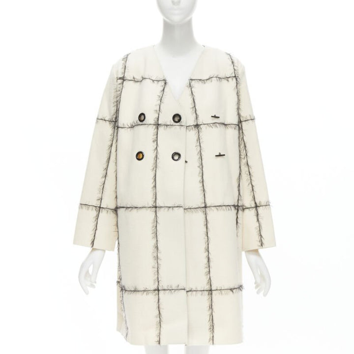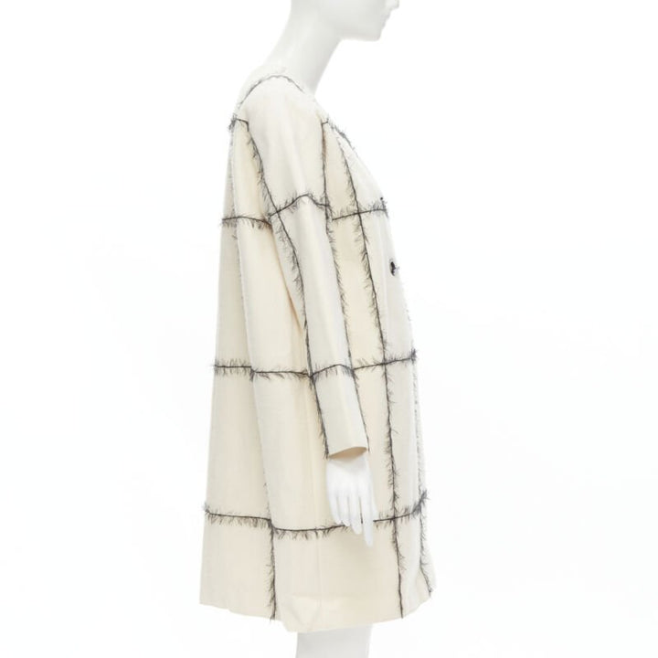 VERONIQUE LEROY cream wool frayed check toggle button double breasted coat FR36