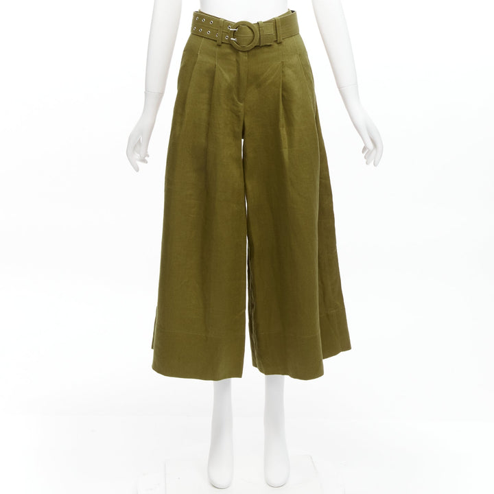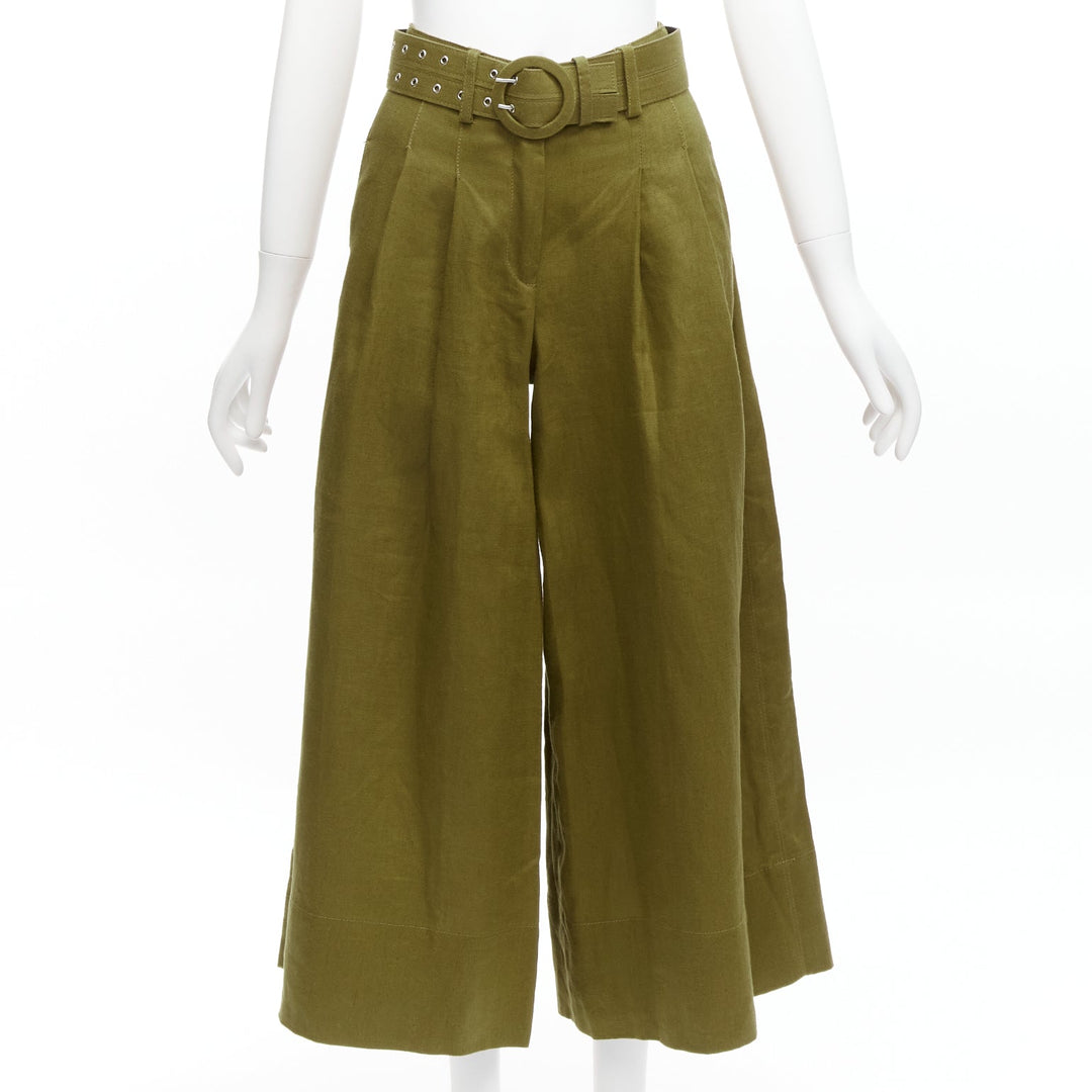 NICHOLAS military green 100% linen high waisted belted wide leg pants US6 M