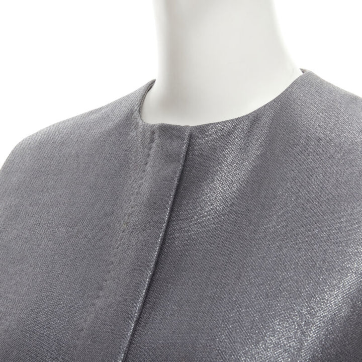 Extra Details: Concealed zip snap button. Metallic lurex silver. Embroidered back exposing nude lining.
