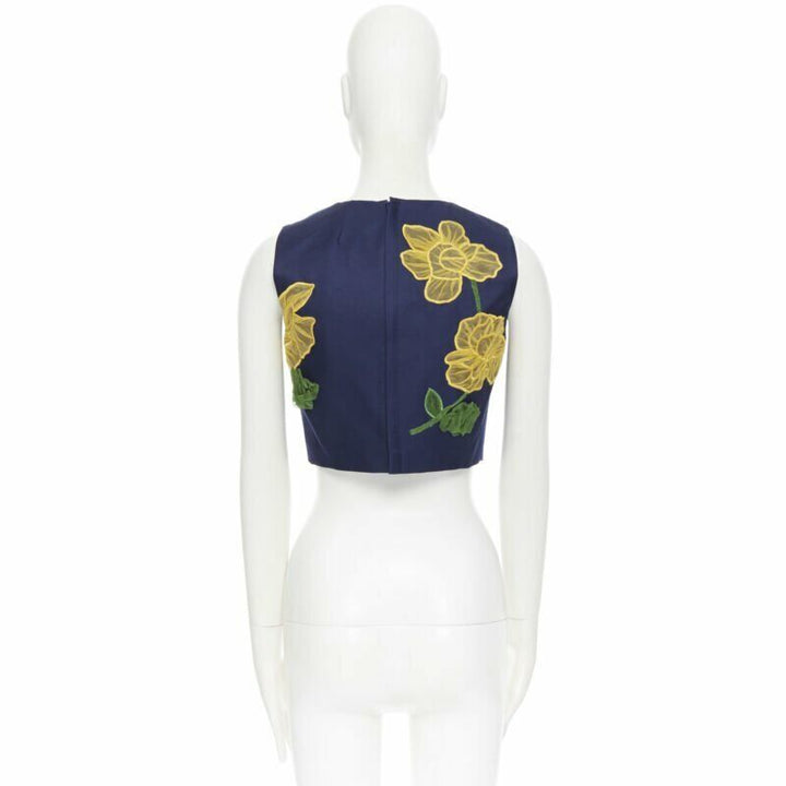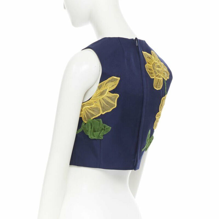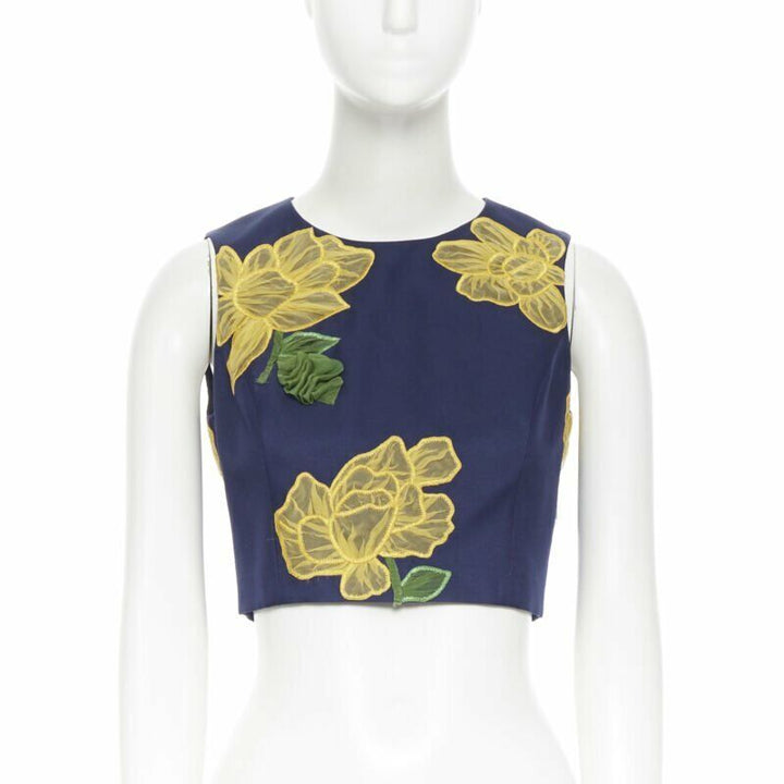 MICHAEL KORS COLLECTION wool silk navy yellow floral sleeveless cropped top US2