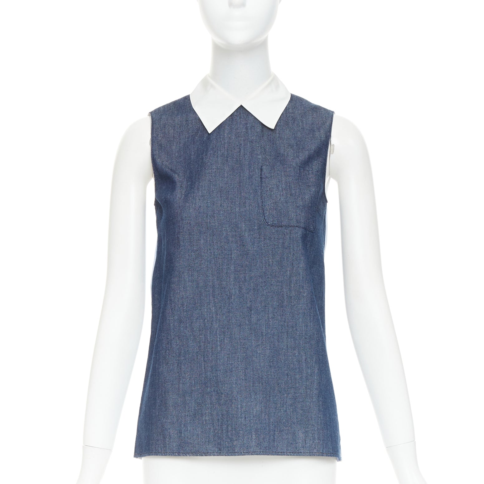 MIU MIU 2015 blue denim patchwork white collar pocket tunic shirt top IT38 XS