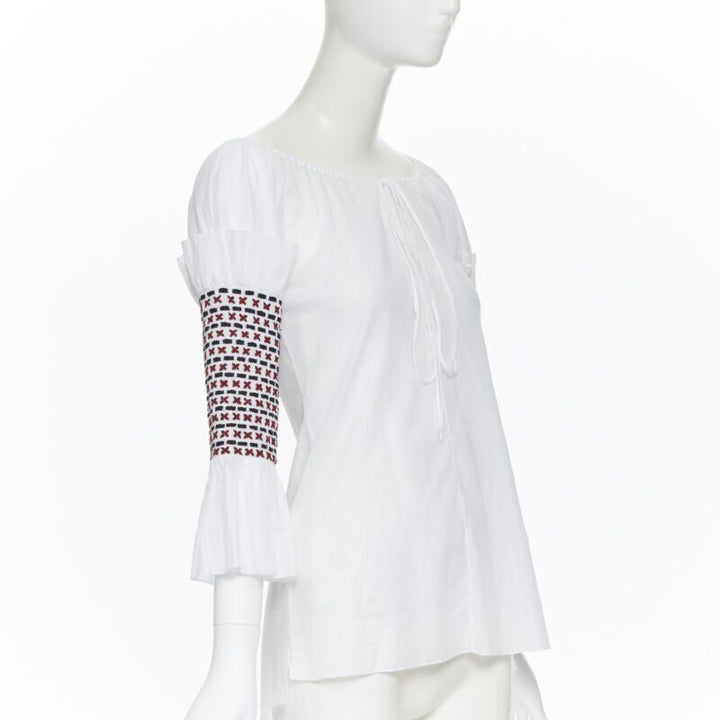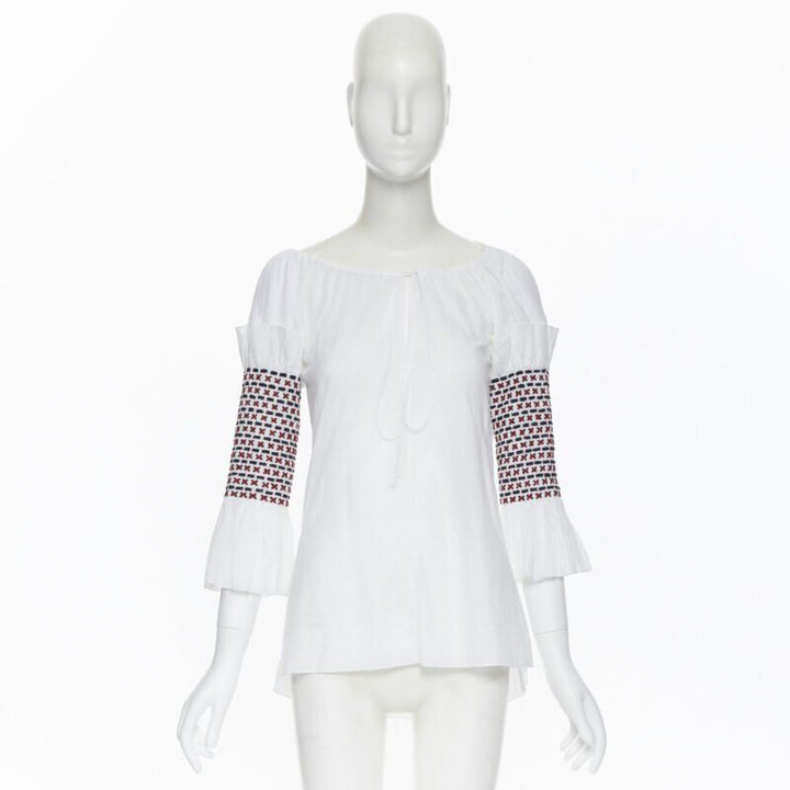 ROSIE ASSOULIN white ethnic embroidery smocked sleeves off shoulder top US4