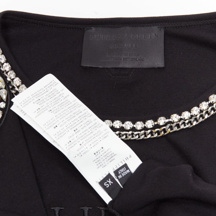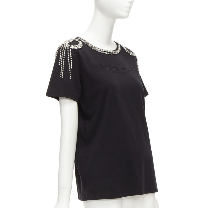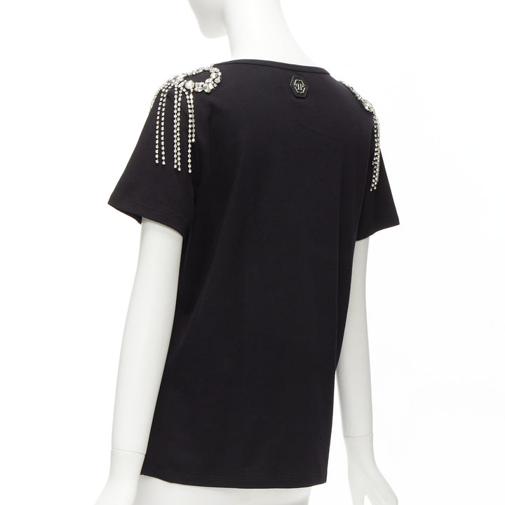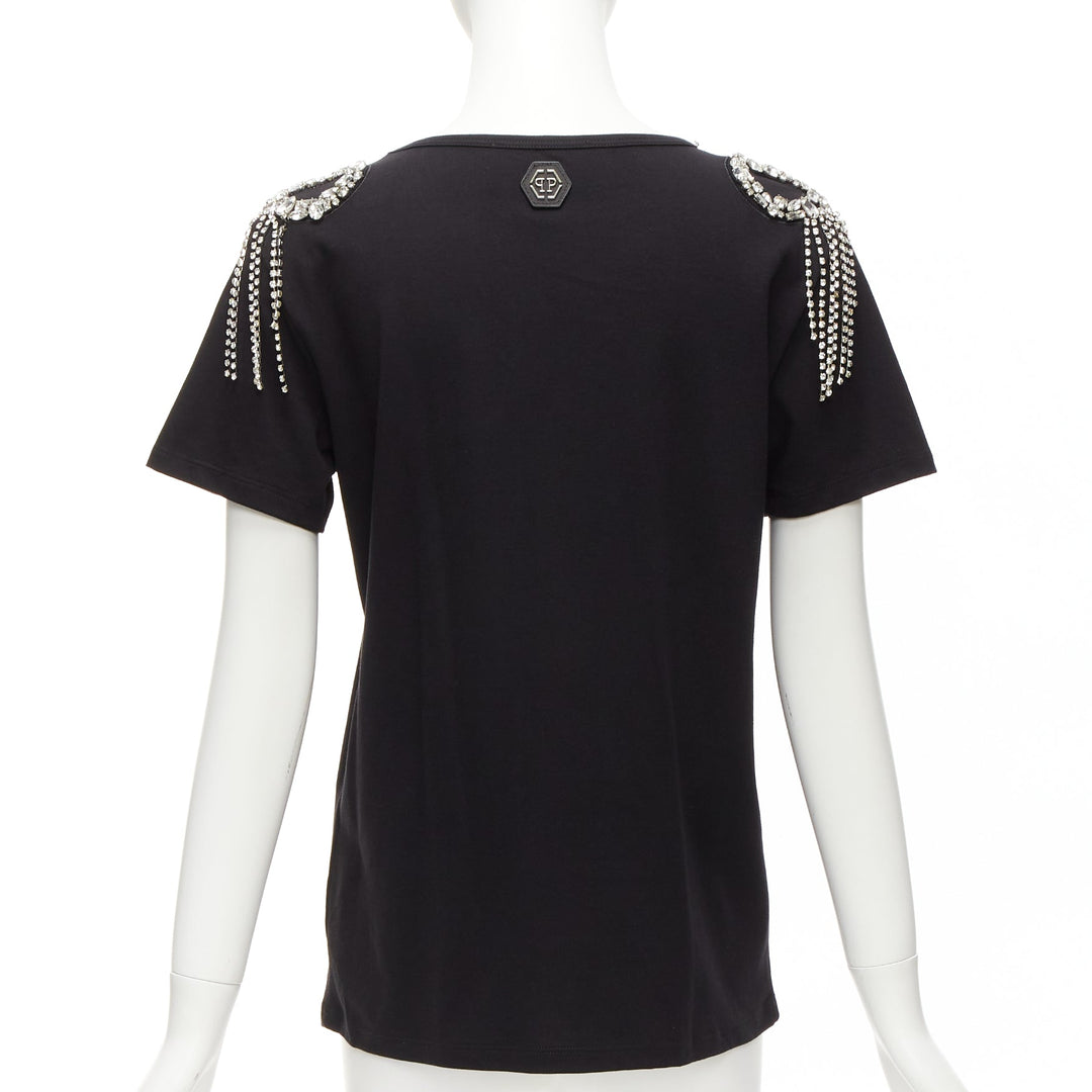 PHILLIP PLEIN black logo embroidery clear crystal fringe embellished tshirt XS