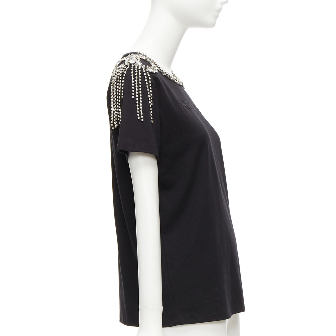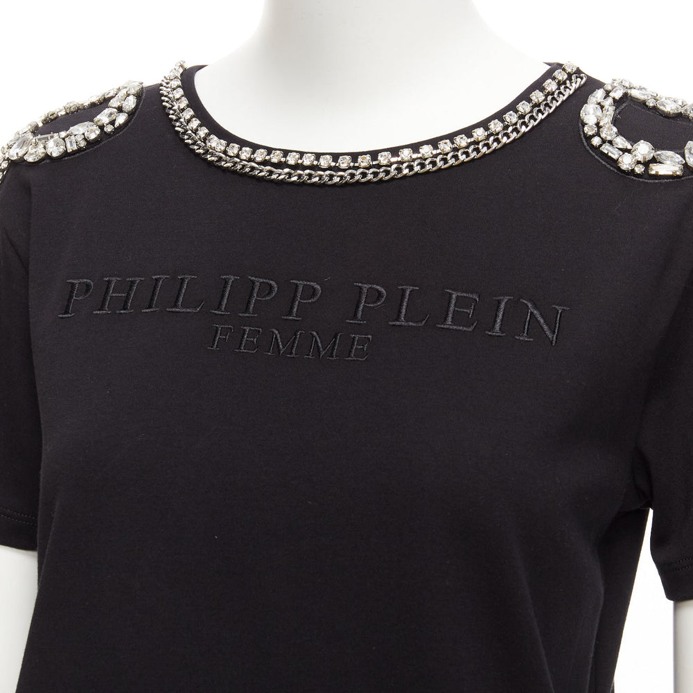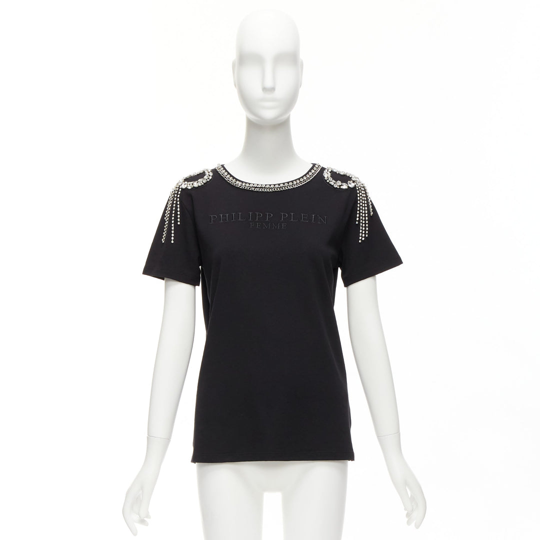PHILLIP PLEIN FEMME black logo embroidery clear crystal fringe embellished tshirt XS