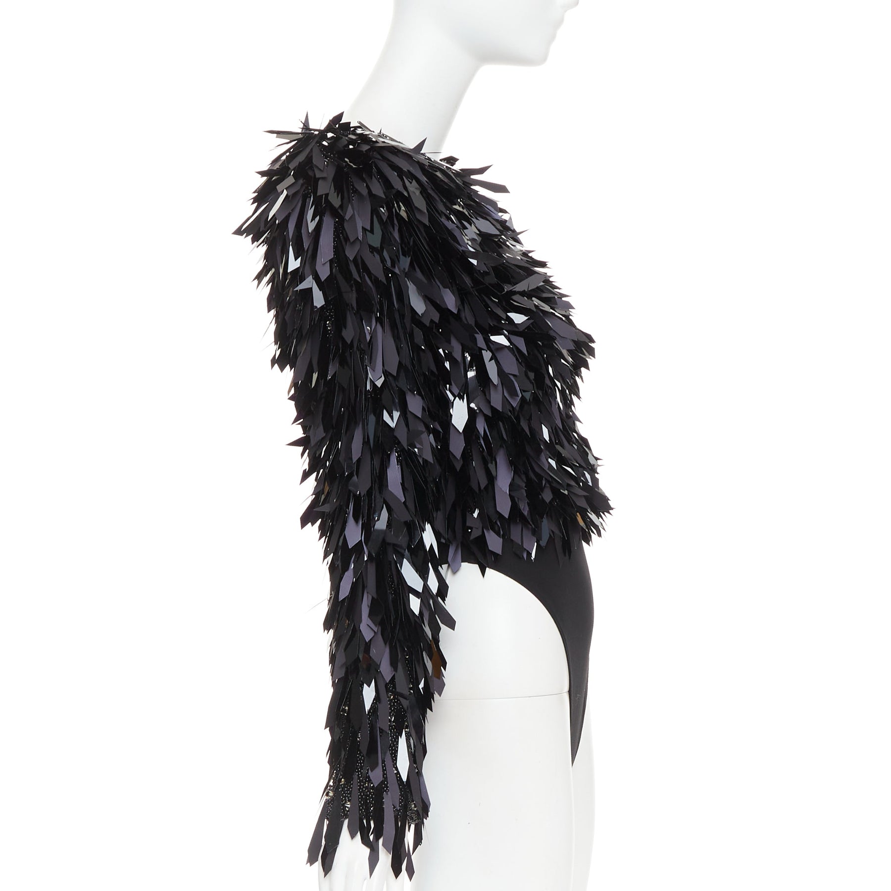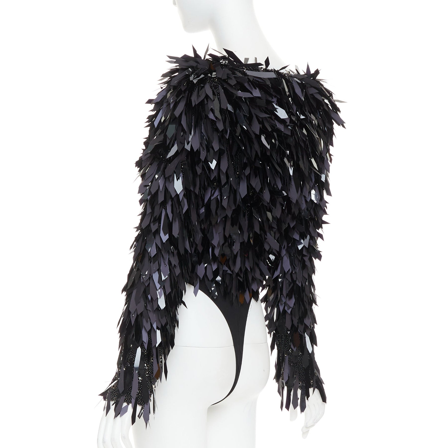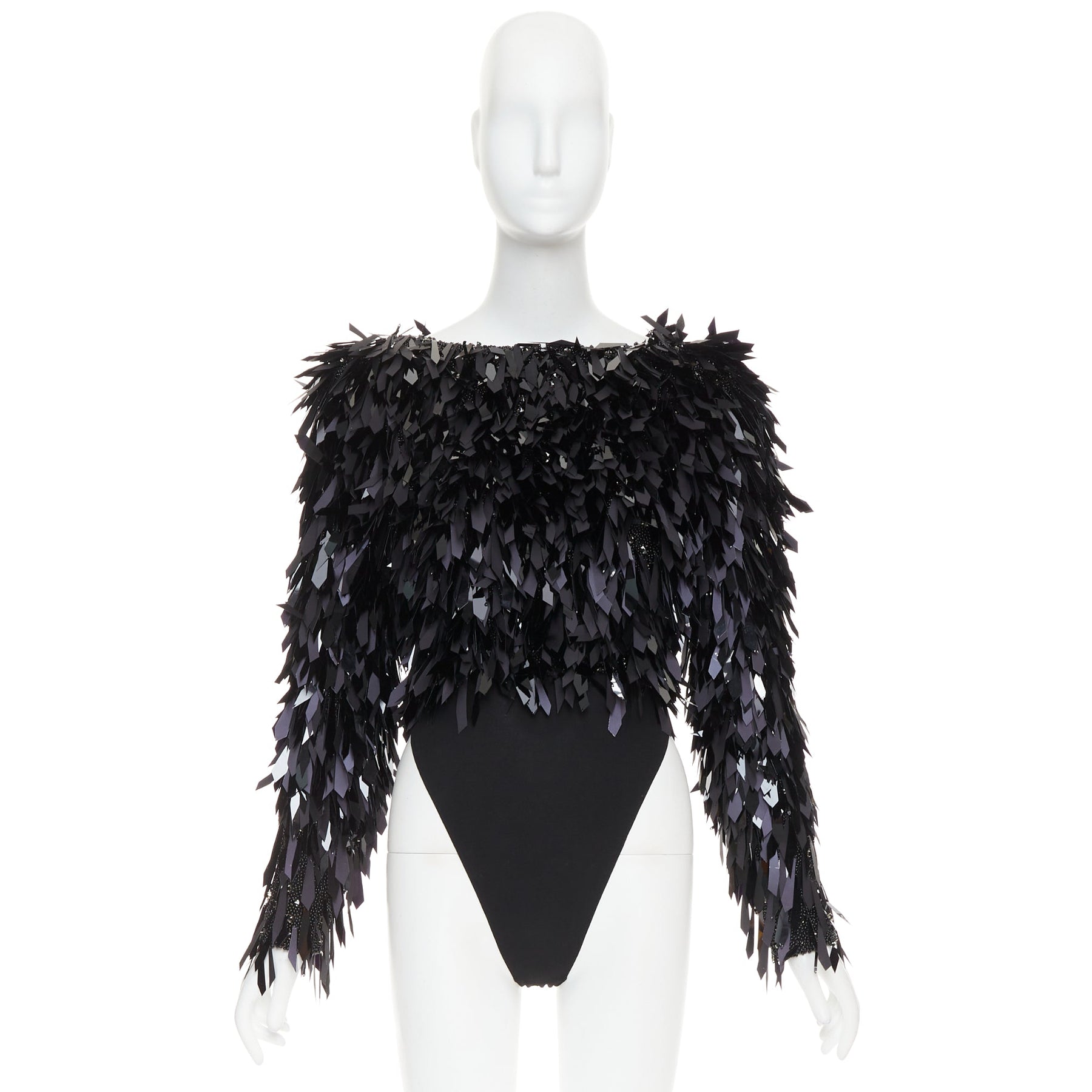 Extra Details: Base is fully encrusted in black plastic beads with angular cut PVC filigree paillette embellished on top. Side bateau neckline. Long sleeves. Zip back closure. Attached bodysuit.