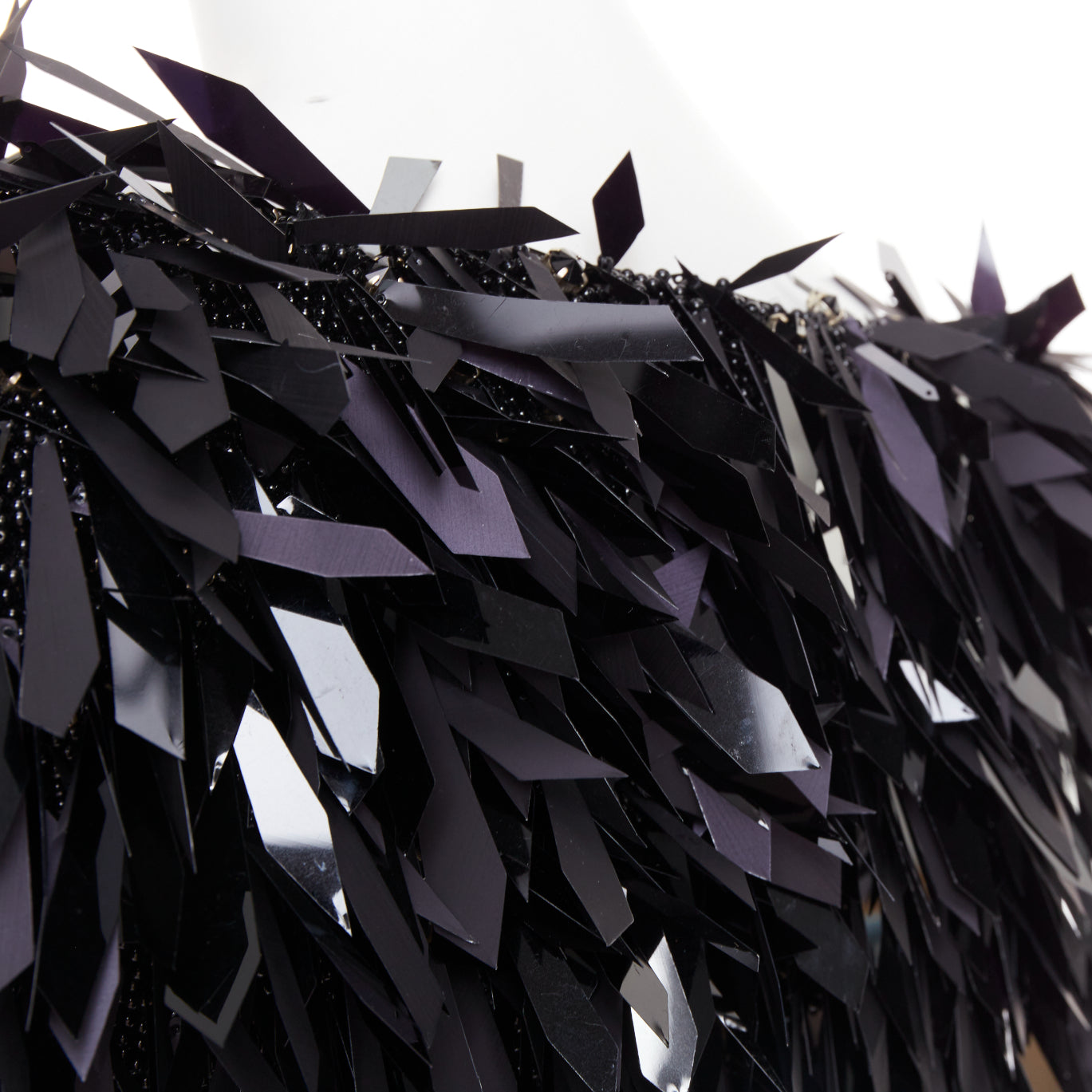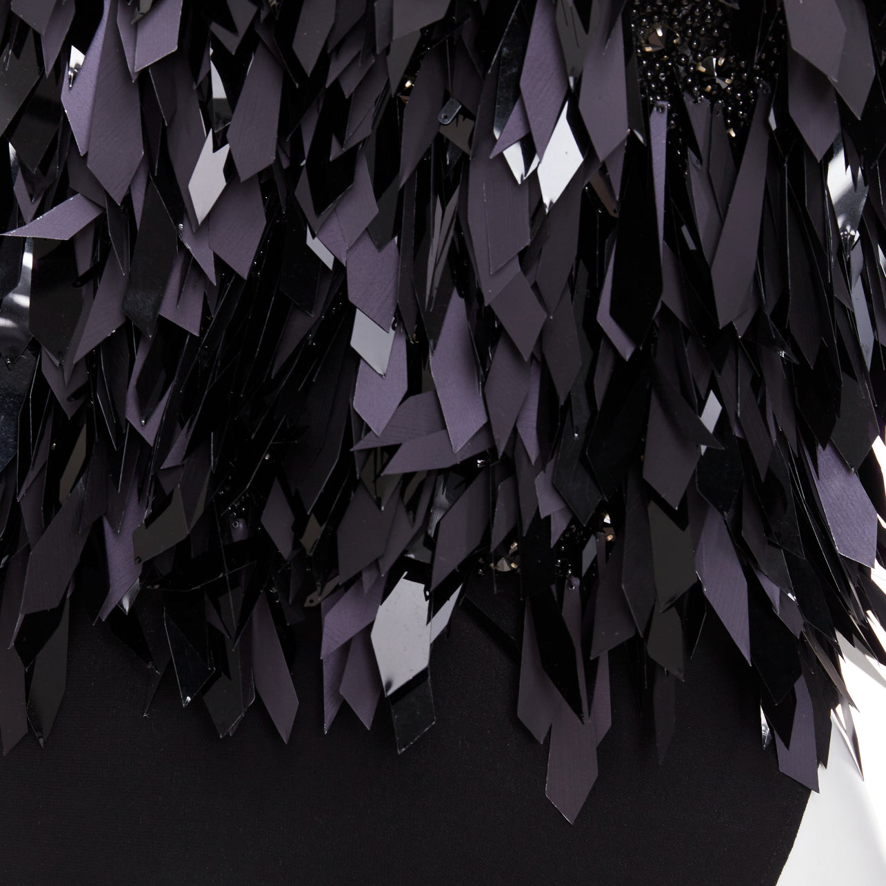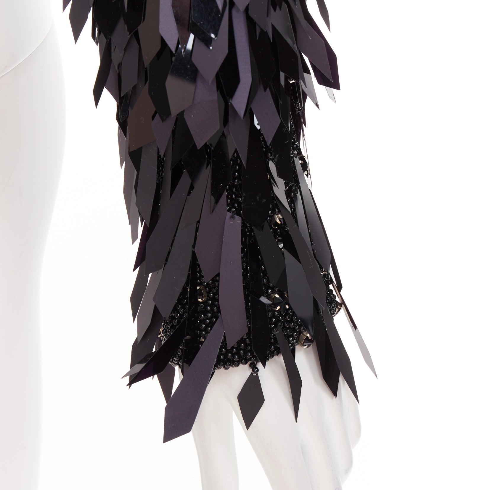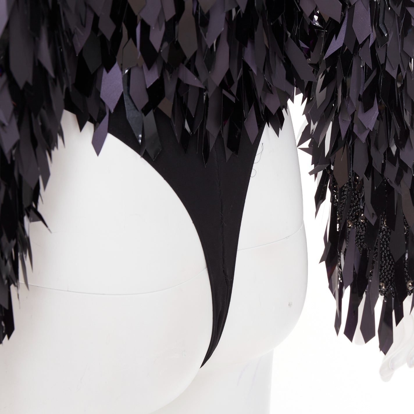 Extra Details: Base is fully encrusted in black plastic beads with angular cut PVC filigree paillette embellished on top. Side bateau neckline. Long sleeves. Zip back closure. Attached bodysuit.