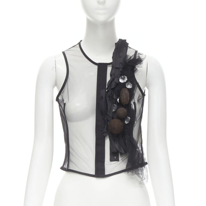 COMME DES GARCONS 2004 black sheer net mesh jewel embellishment ruffle vest S