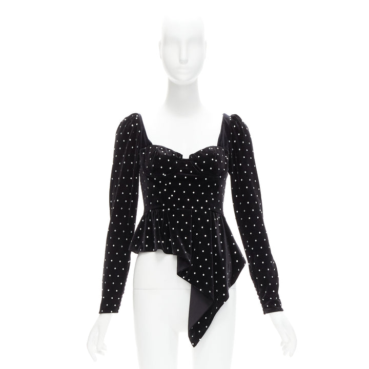 Extra Details: black top showcases the elegance and femininity inherent to the label. It’s crafted from mid-weight velvet with a sweetheart-style bodice and features flared cuffs and a draping slanted hem, all detailed with crystal studs that give it a charming twinkling effect.