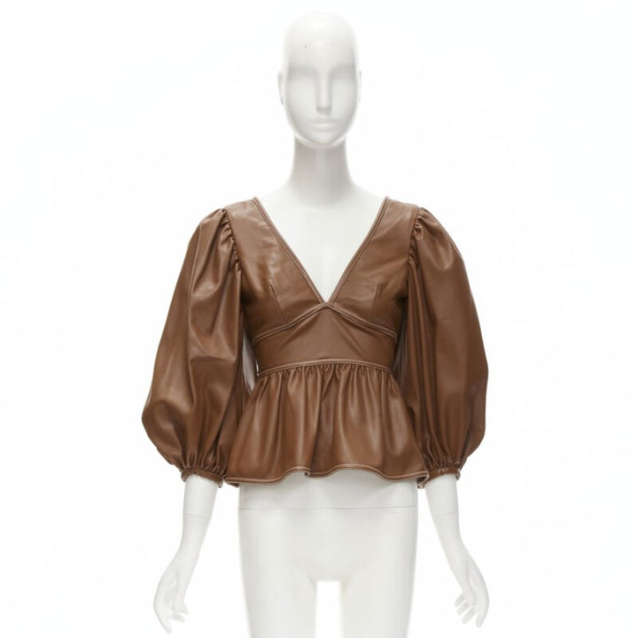 STAUD Luna tan brown vegan faux leather plunge neck puff sleeve top US0 XS