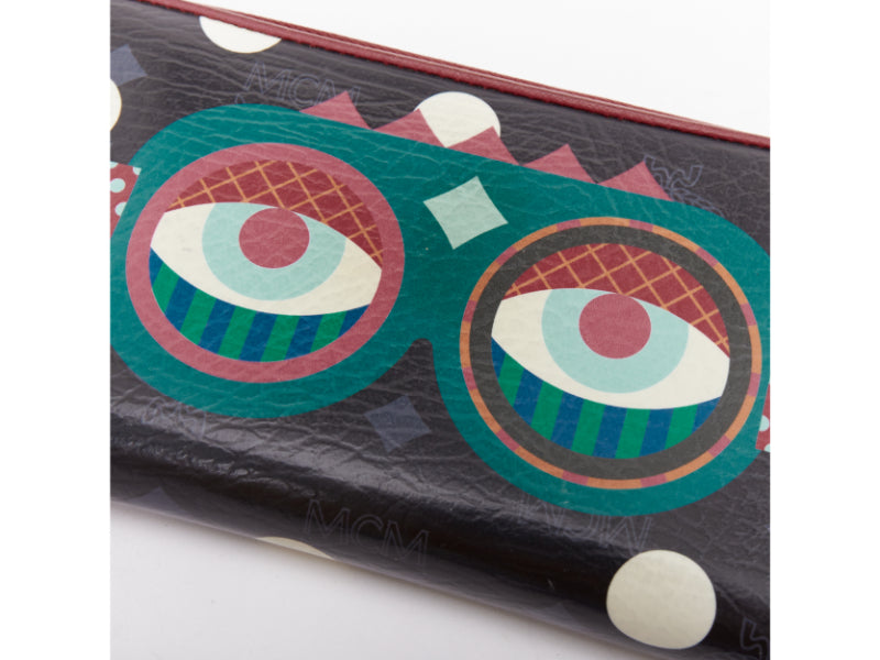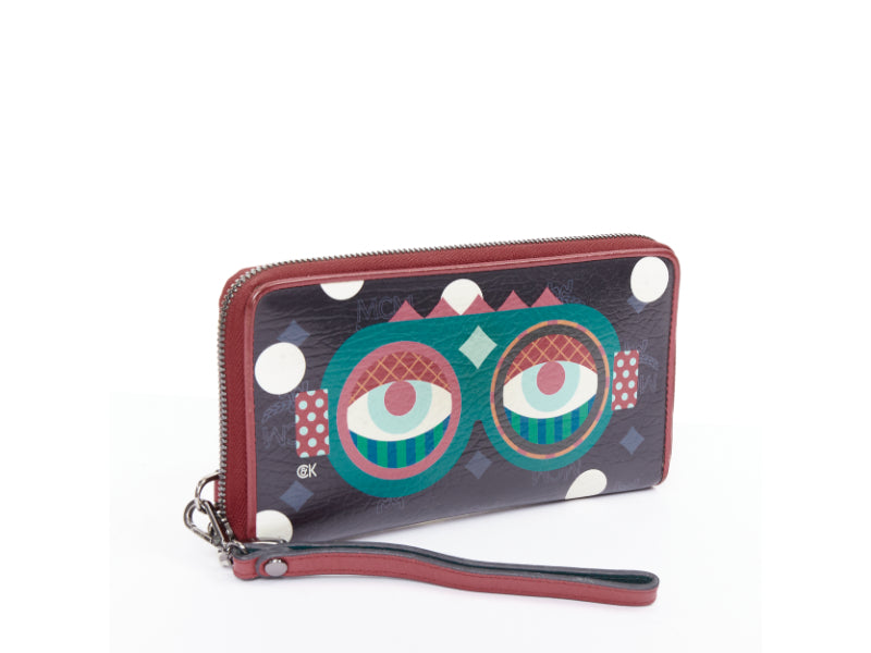 Extra Details: Zip-around long wallet with a detachable wristlet strap. MCM Visetos coated canvas. The unique graphic, featuring abstract, colorful eyes within a ski goggle design, is the signature artistic style of the international artist duo Craig & Karl.