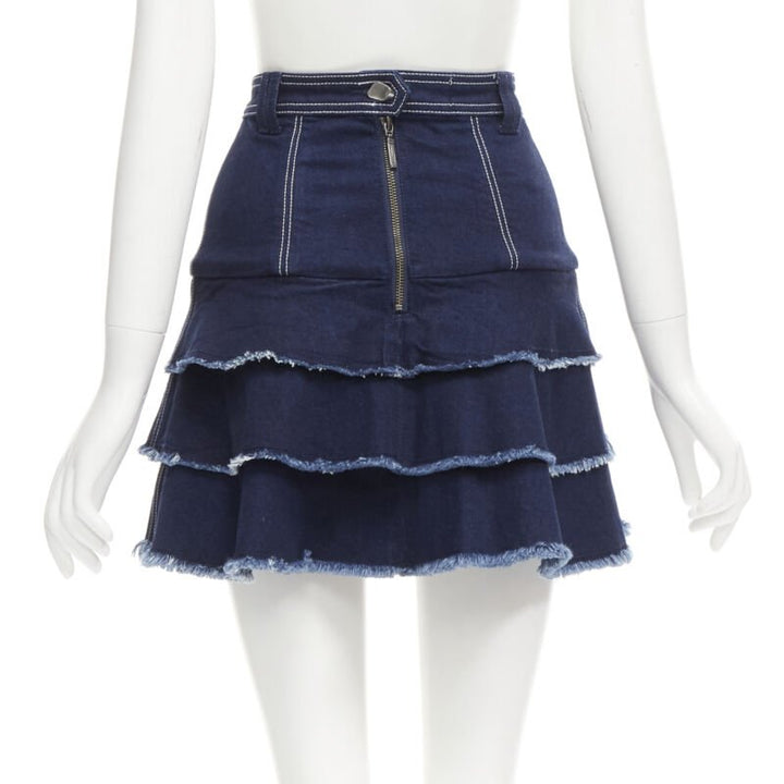 AJE hammered silver buttons blue frayed edge tiered denim skirt UK6 XS