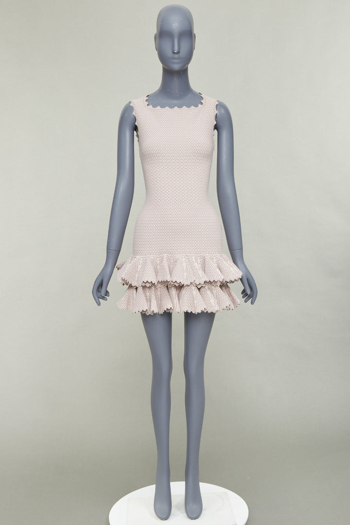 Extra Details: Azzedine Alaaa textured skater dress from the Fall 2011 Runway Collection, featuring a pink and white stretch-knit design with a dotted woven pattern, scalloped edges, a ruffled mermaid-tiered hem, and a side zip closure.