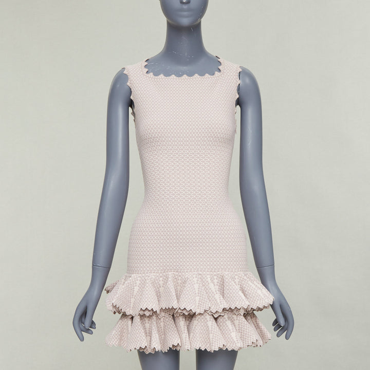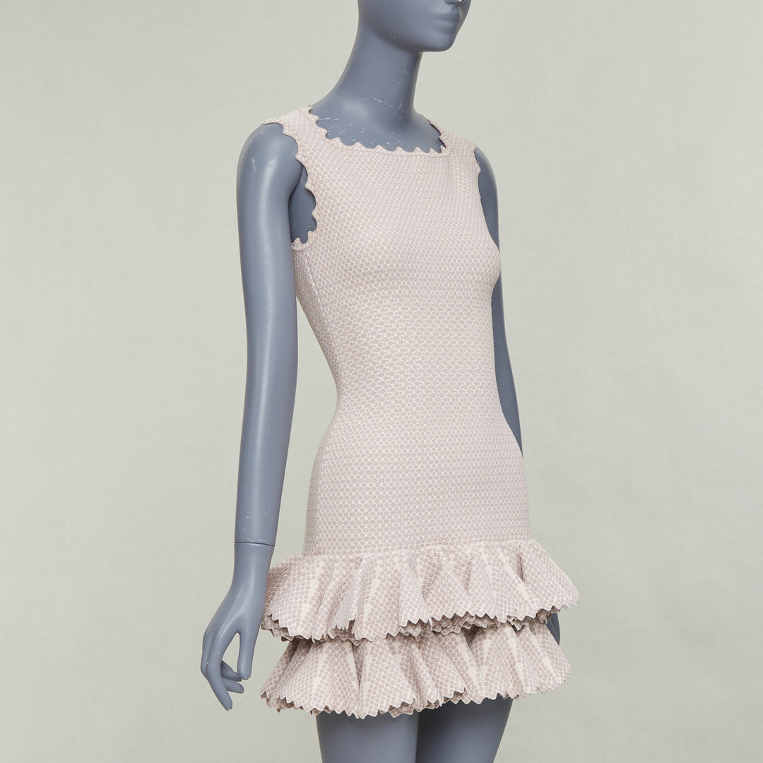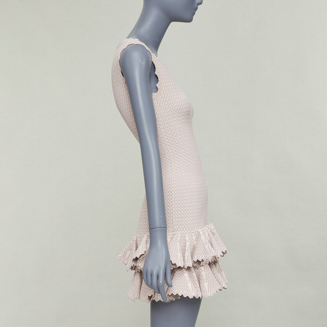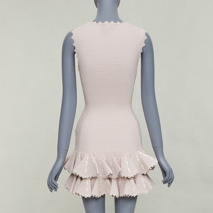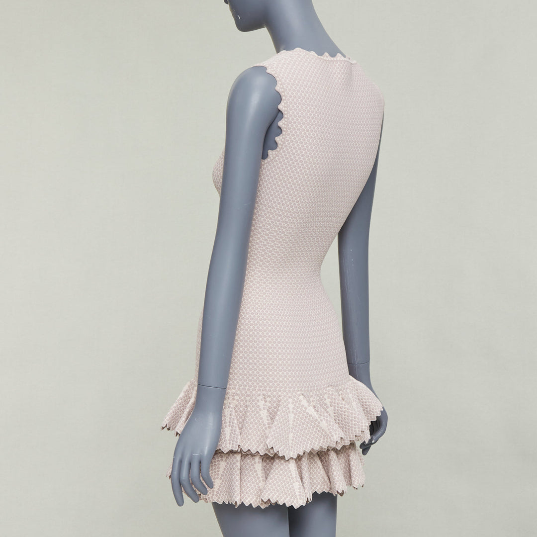 ALAIA 2011 pink white beige textured dot weave scalloped ruffle mermaid tiered dress FR36 S