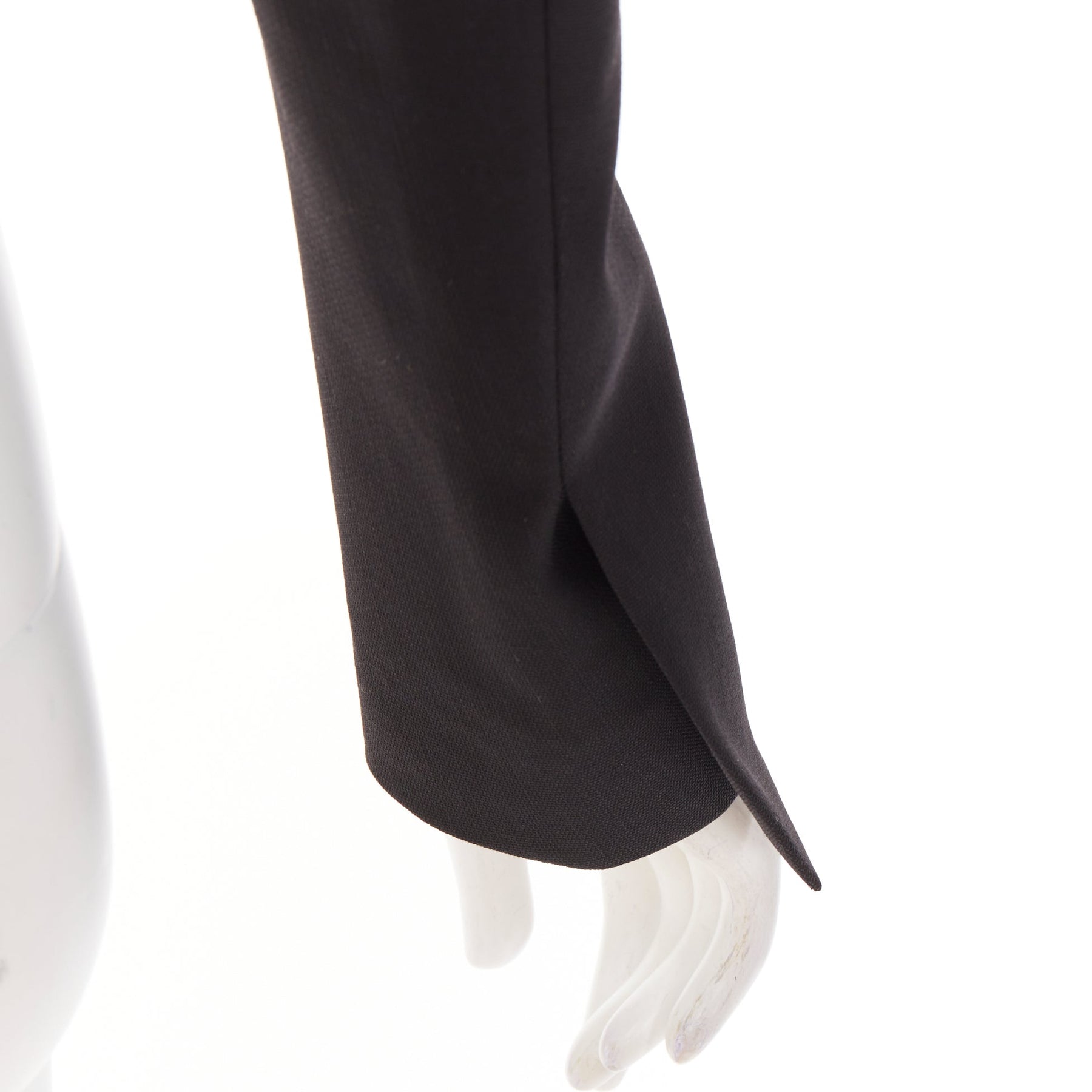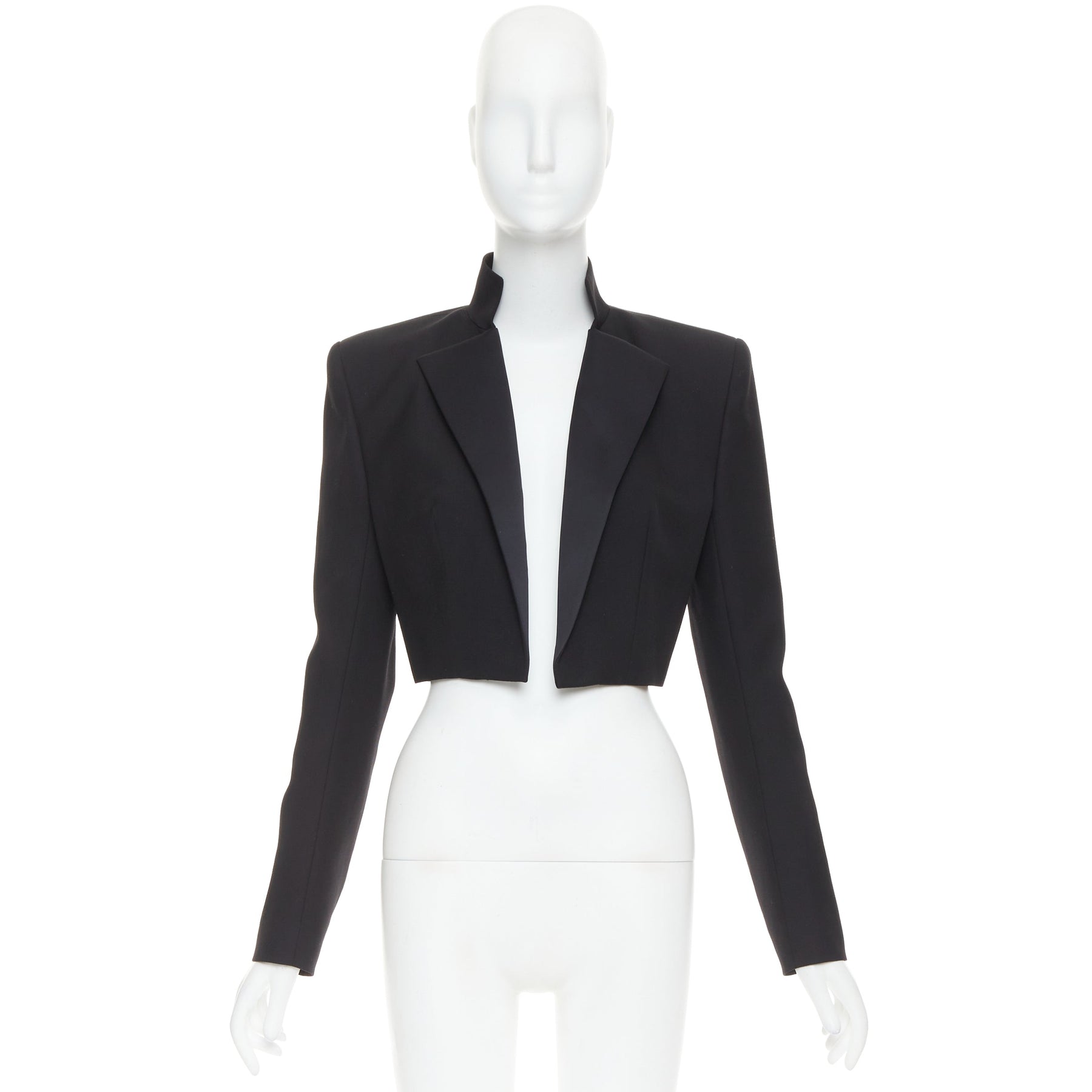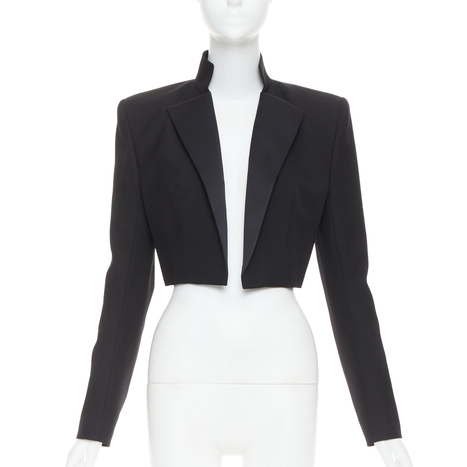 Extra Details: Alexandre Vauthier short tuxedo cropped blazer in black. This signature style is tailored with a deep V-neckline, satin peak lapels, and characteristically strong, padded shoulders. There is a concealed metal spring wire at back of neck for collar to pop and stand all the time.