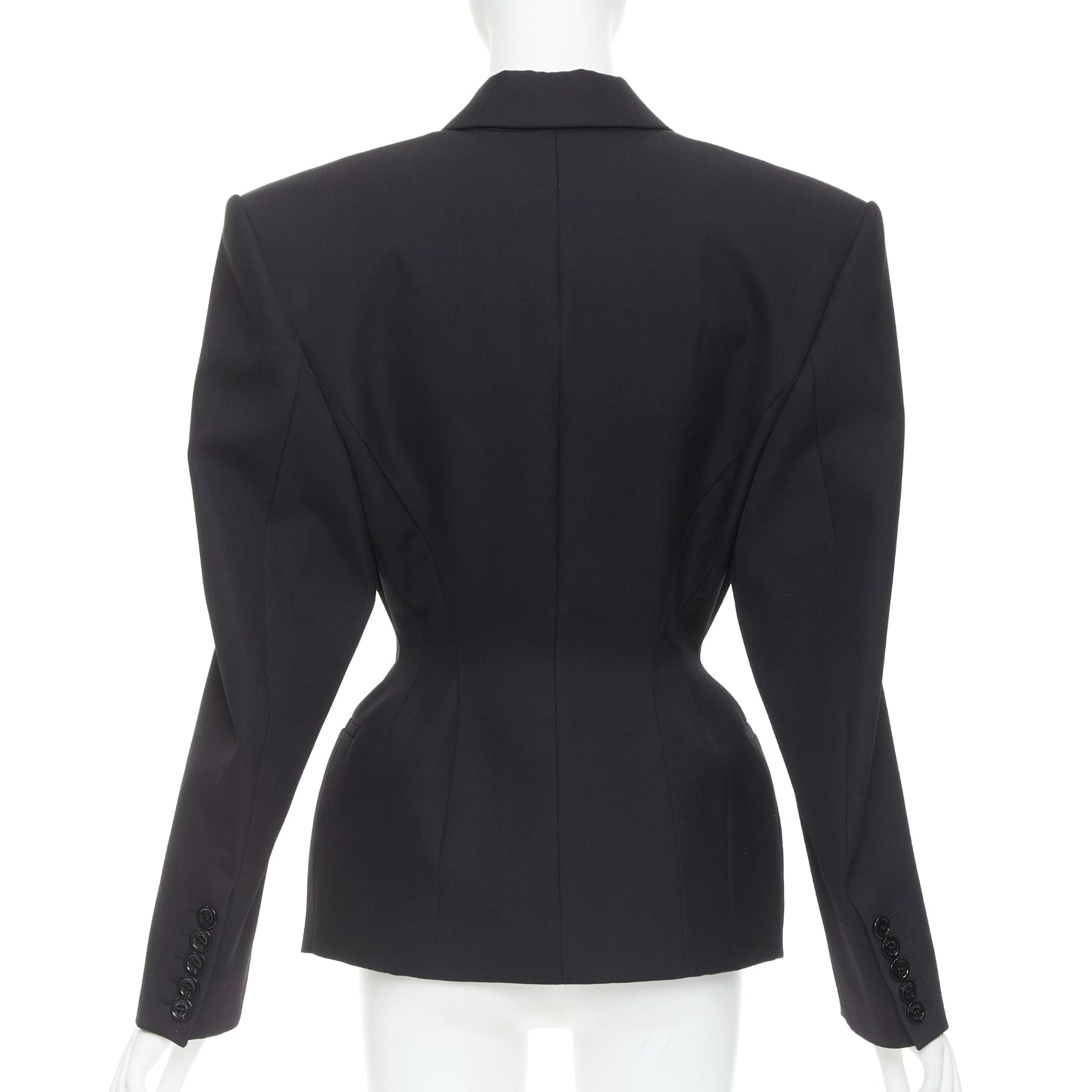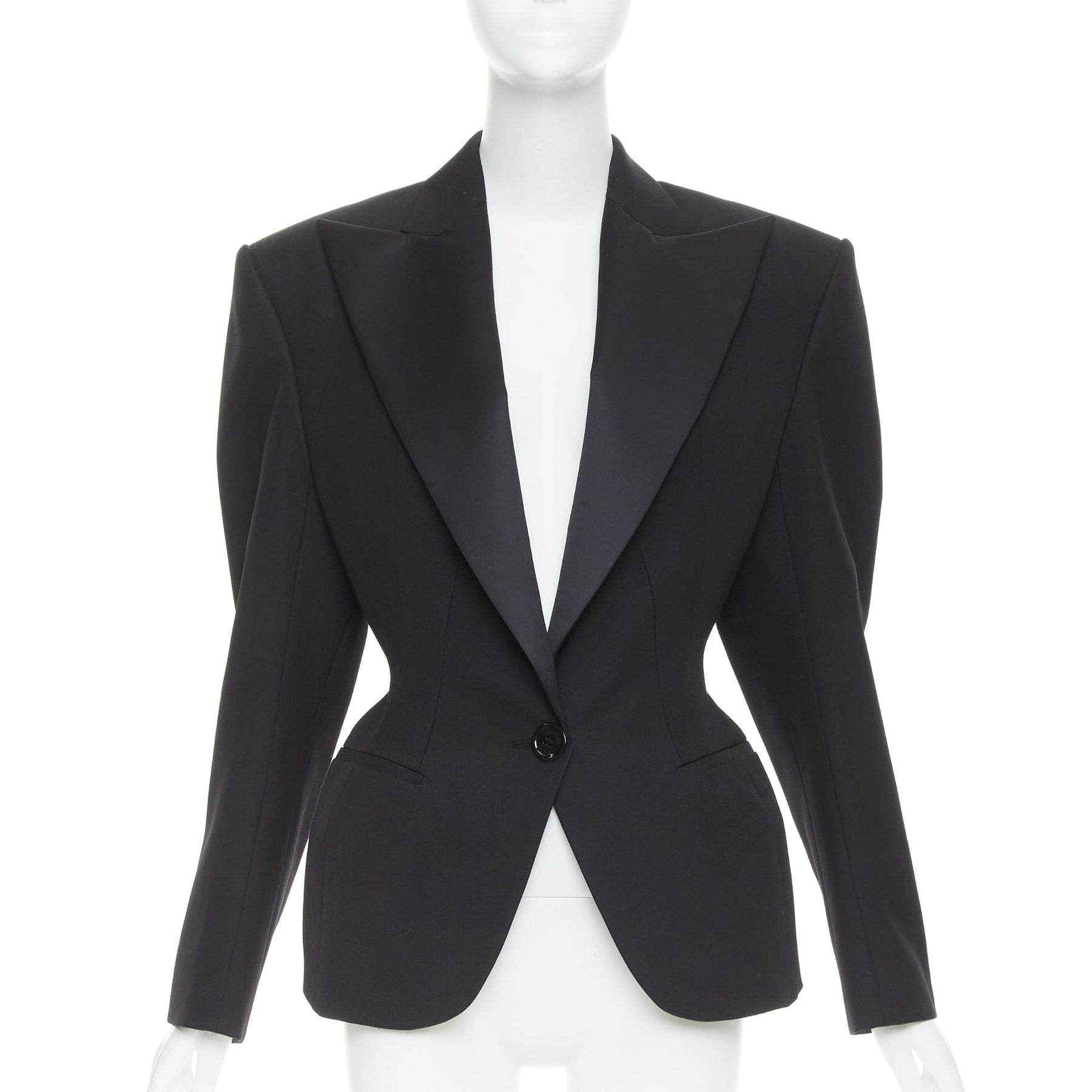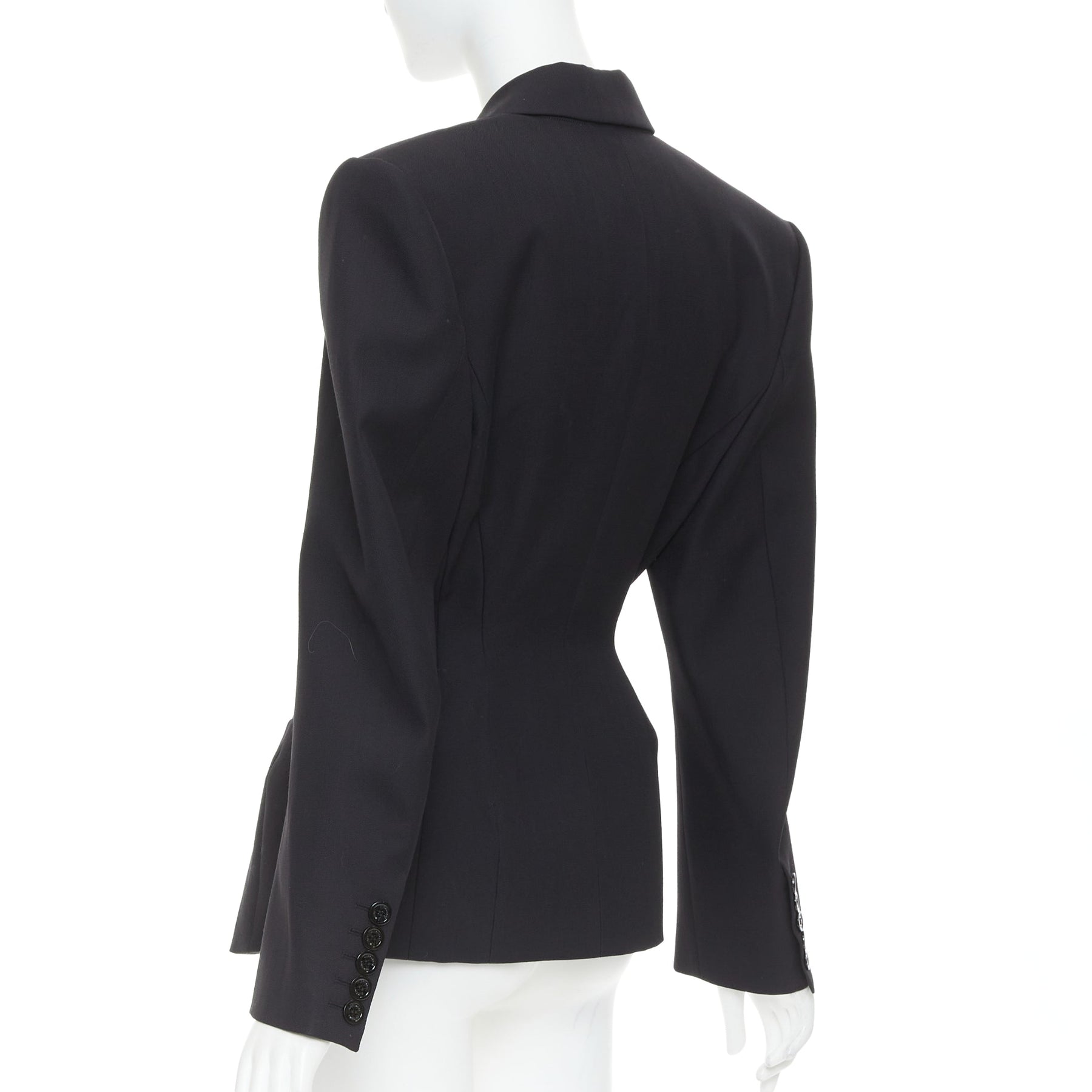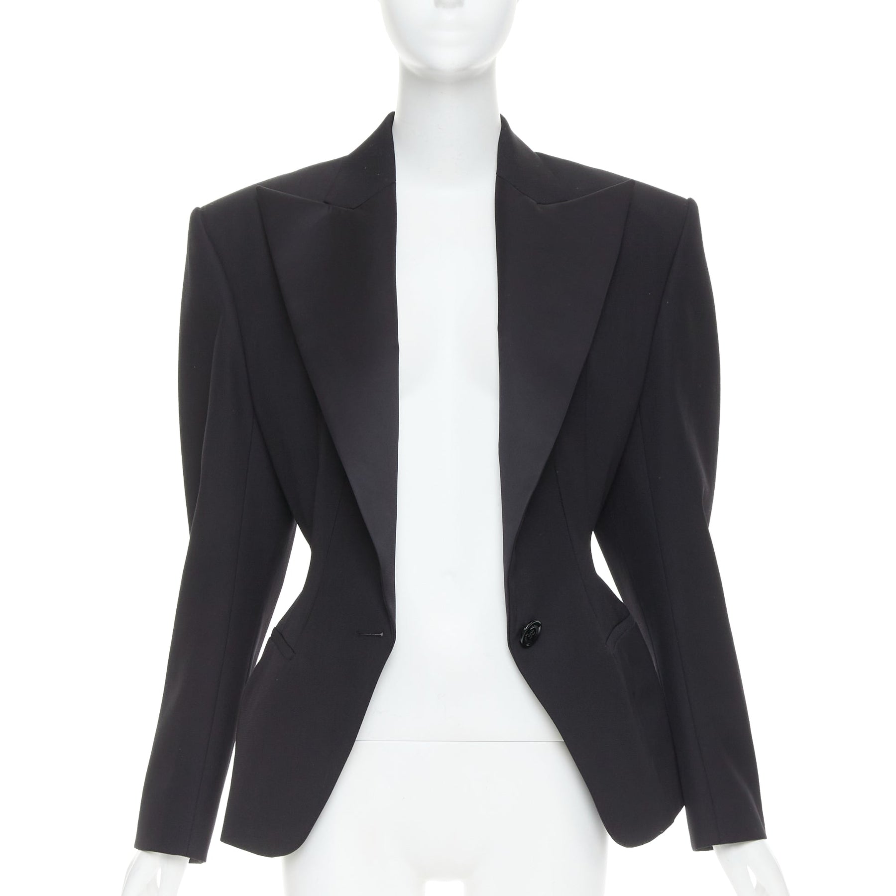 Extra Details: Alexandre Vauthier single-breasted wool blazer in black, featuring a dramatic, plunging neckline with satin peak lapels. Vauthier style is known for its impeccable, structured tailoring, including strong, padded shoulders and a fitted waist.