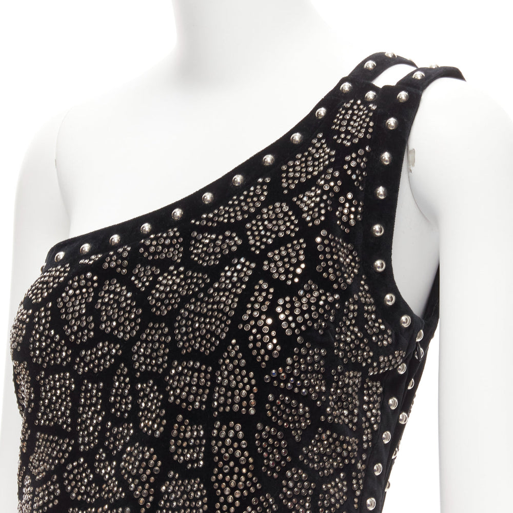 BALMAIN Olivier Rousteing 2017 silver studded bead embellished black velvet one shoulder dress L