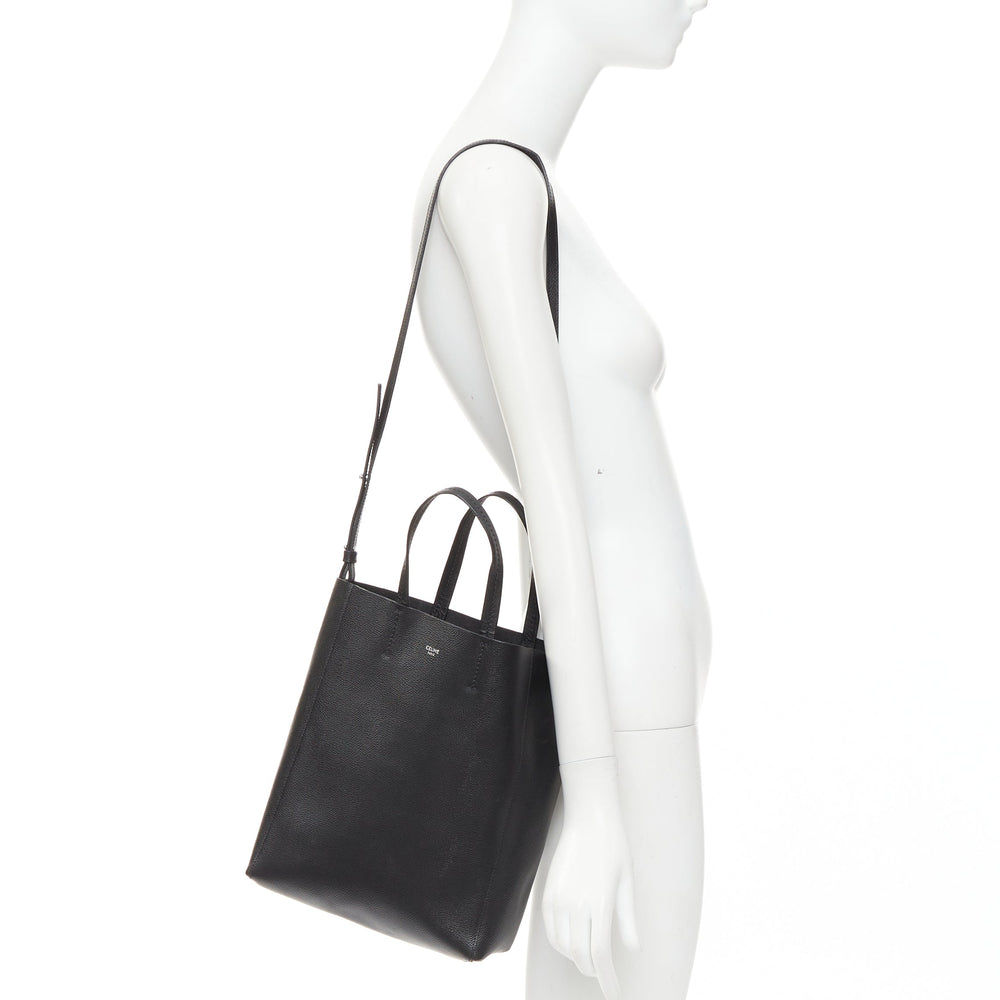 Extra Details: Shoulder strap CELINE Grained Calfskin Small Vertical Cabas in black. Crafted from grained calfskin leather, this tall tote features leather handles and an adjustable leather shoulder strap. The top opens to a black microfiber interior with a hanging zipper pocket.