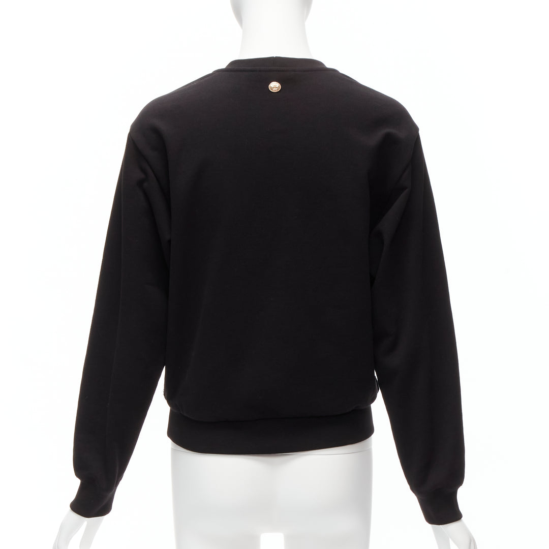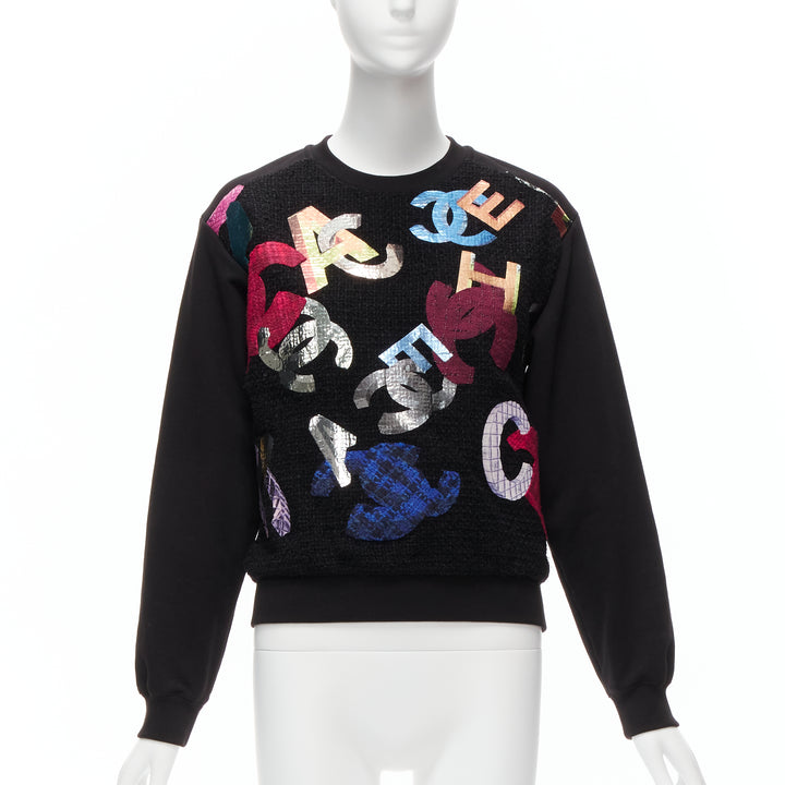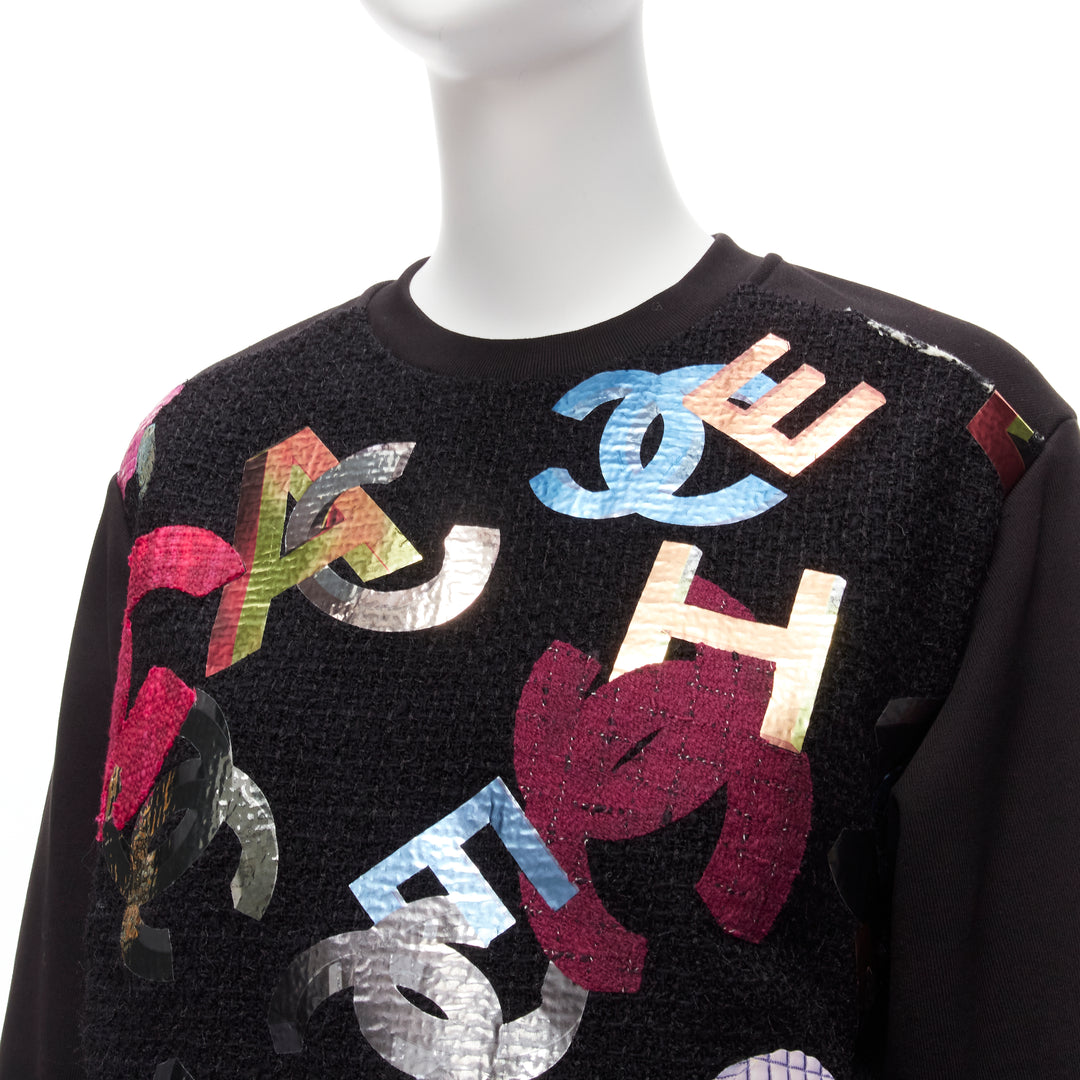 CHANEL 2022 Runway metallic CC logo graphic black tweed crew sweater FR34 XS