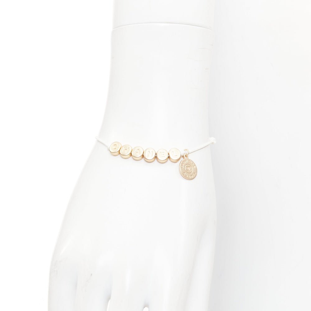 CHANEL white gold tone logo letter bead charm white thread lucky bracelet