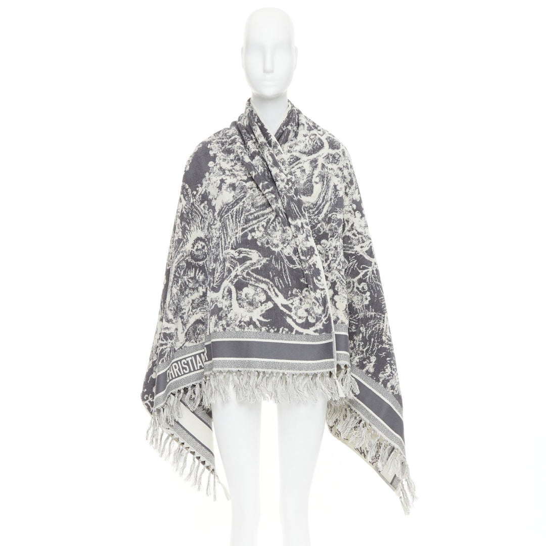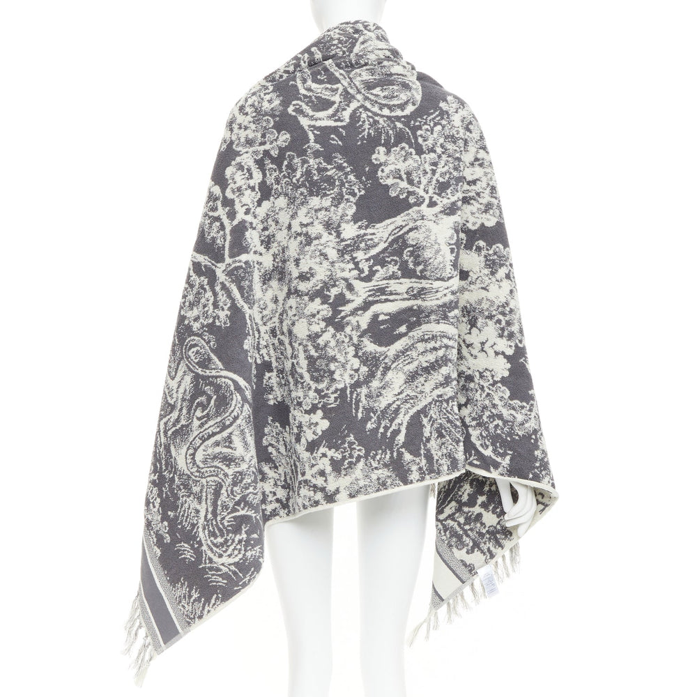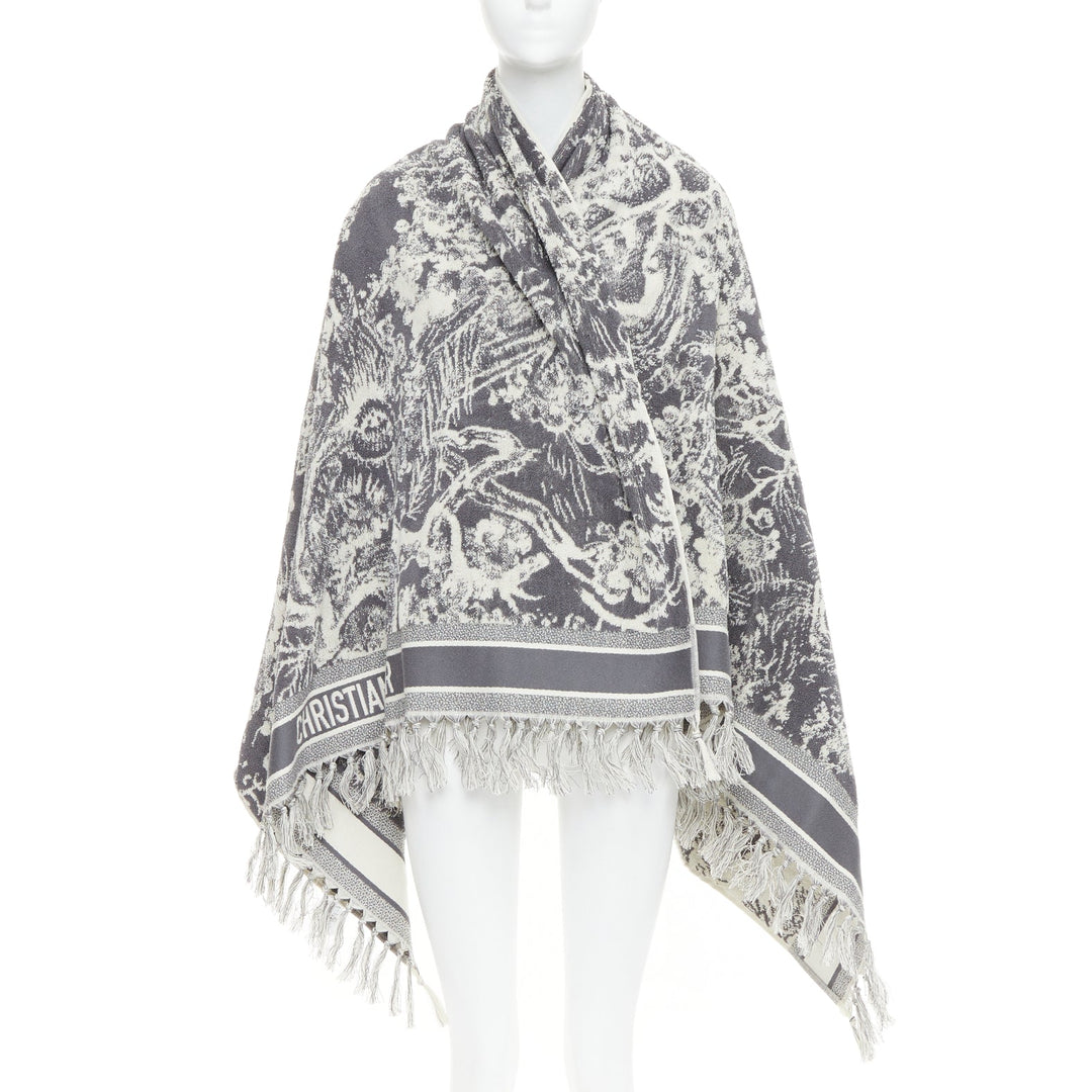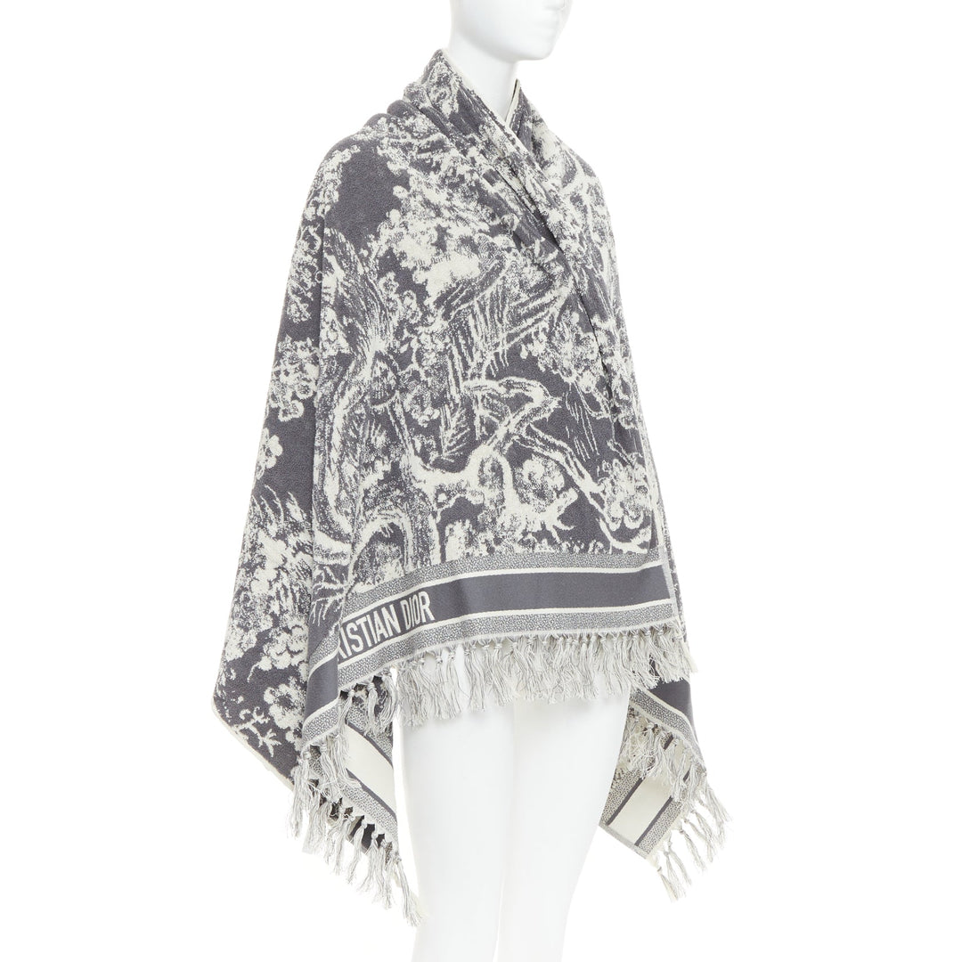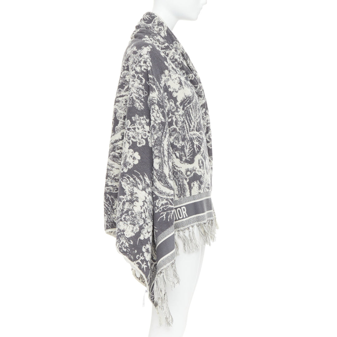 Extra Details: CHRISTIAN DIOR Cotton Toile De Jouy Reverse Towel in Grey and Ivory. This towel features the artwork of tigers and CHRISTIAN DIOR motifs on each end, accented by tassels.