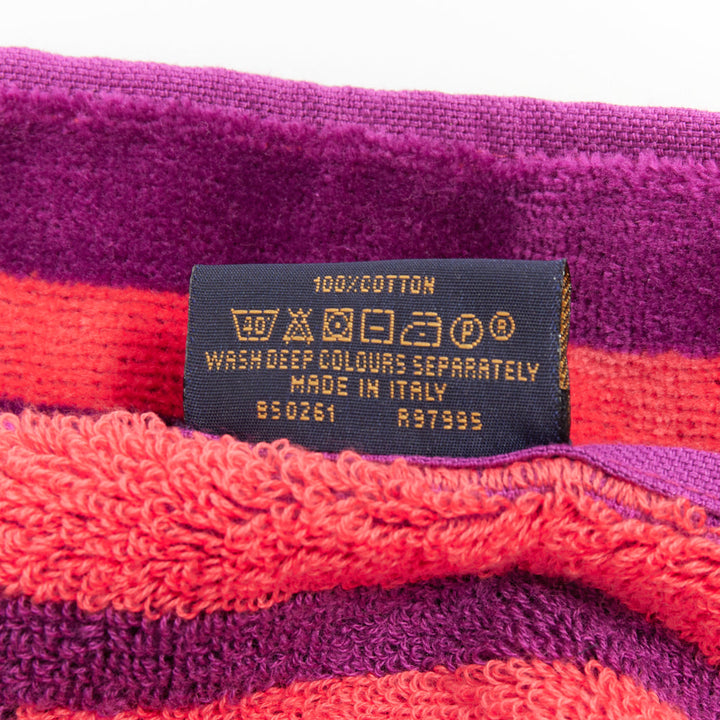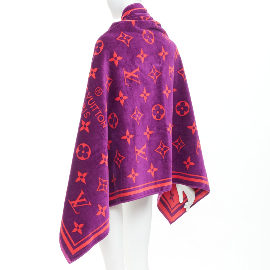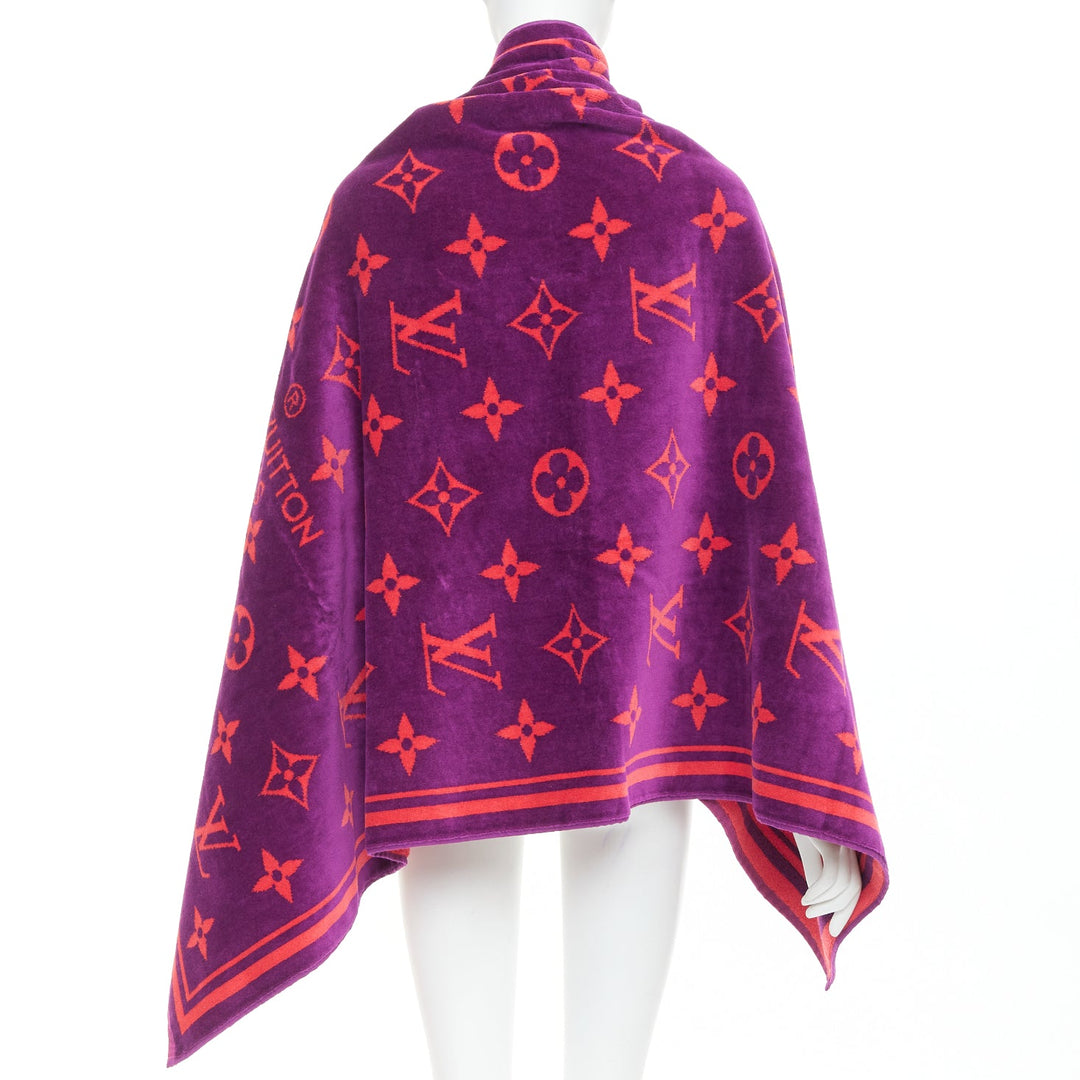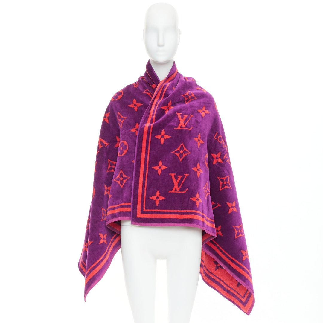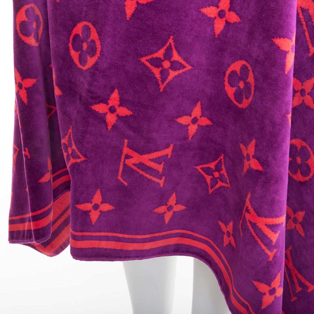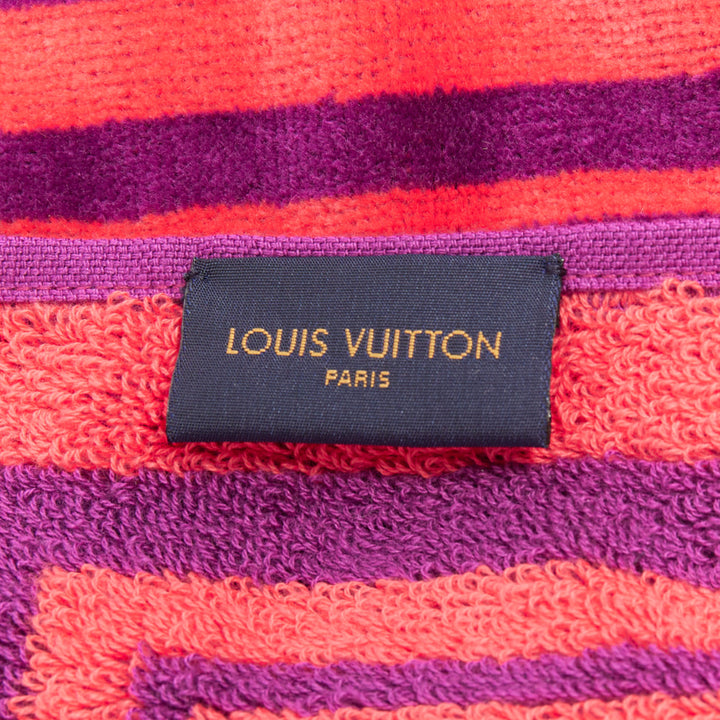 Extra Details: Purple and pink cotton Louis Vuitton beach towel with brand signature Vuittamins Monogram pattern motif throughout and brand label at reverse. Made in Italy.