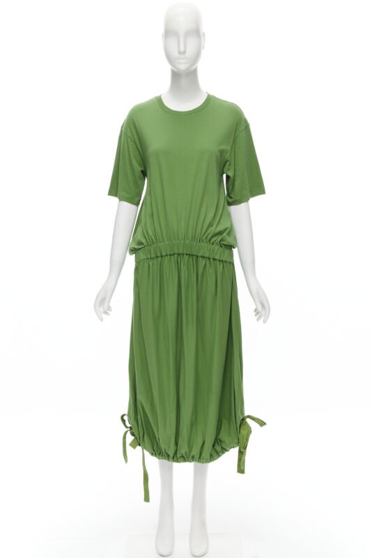 MARNI green cotton waist grosgrain bow drawstring hem t-shirt dress IT38 XS