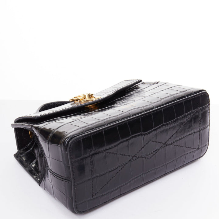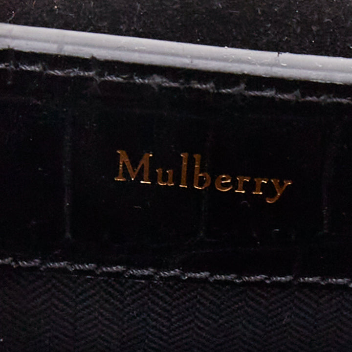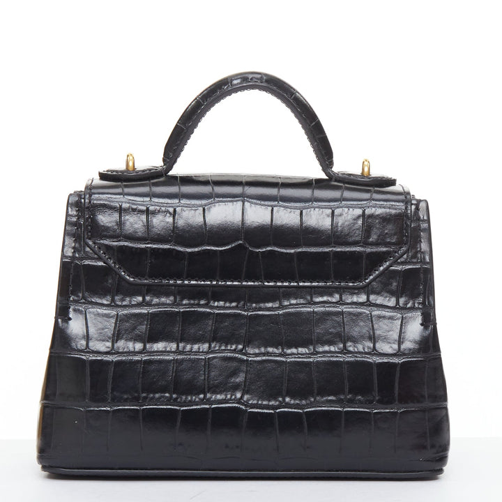 Extra Details: Mulberry Micro Seaton satchel in shiny croc-embossed calfskin leather, finished in black. Features a rolled leather top handle with gold-tone links, an optional shoulder strap, and elegant gold hardware. The flap opens to a black fabric-lined interior with a convenient patch pocket.