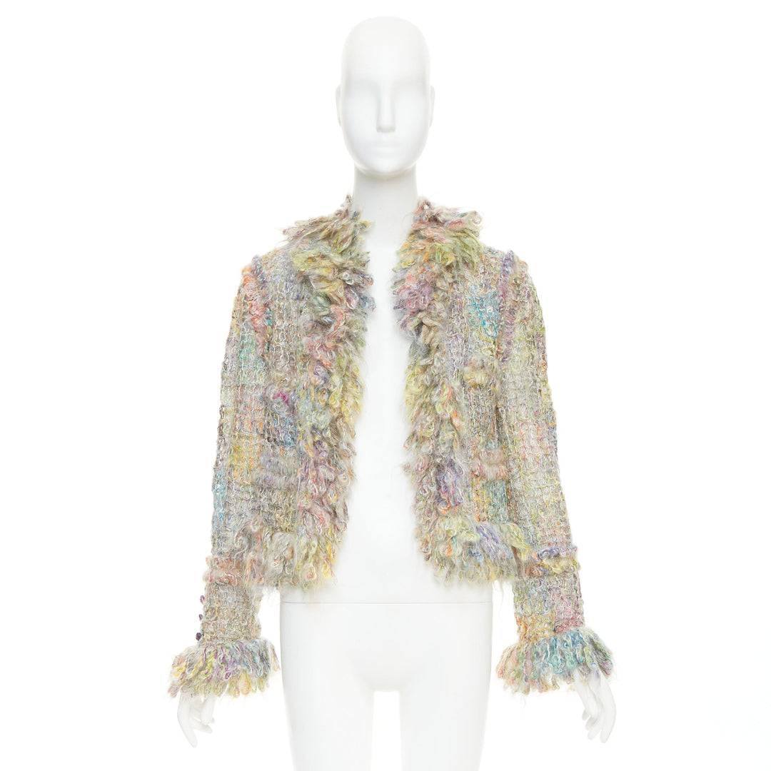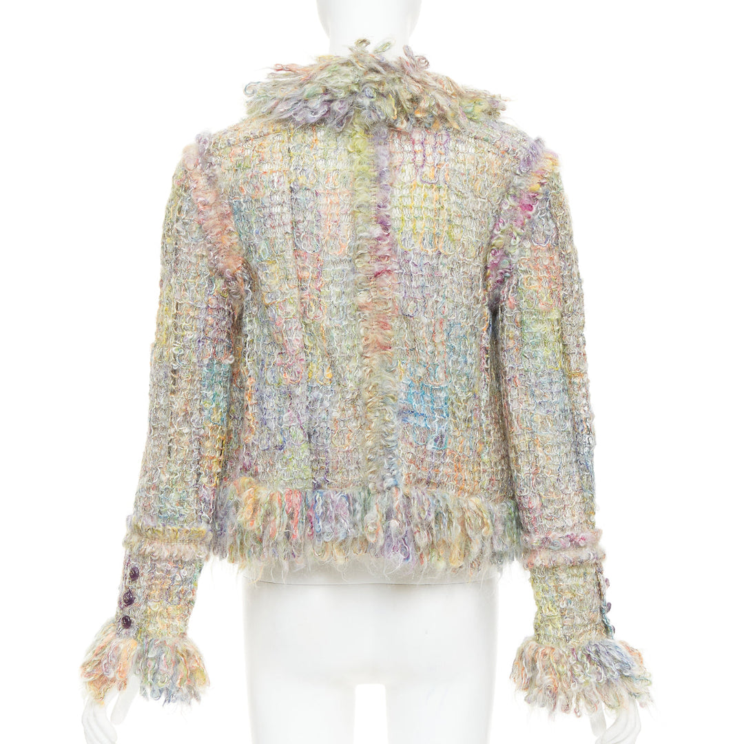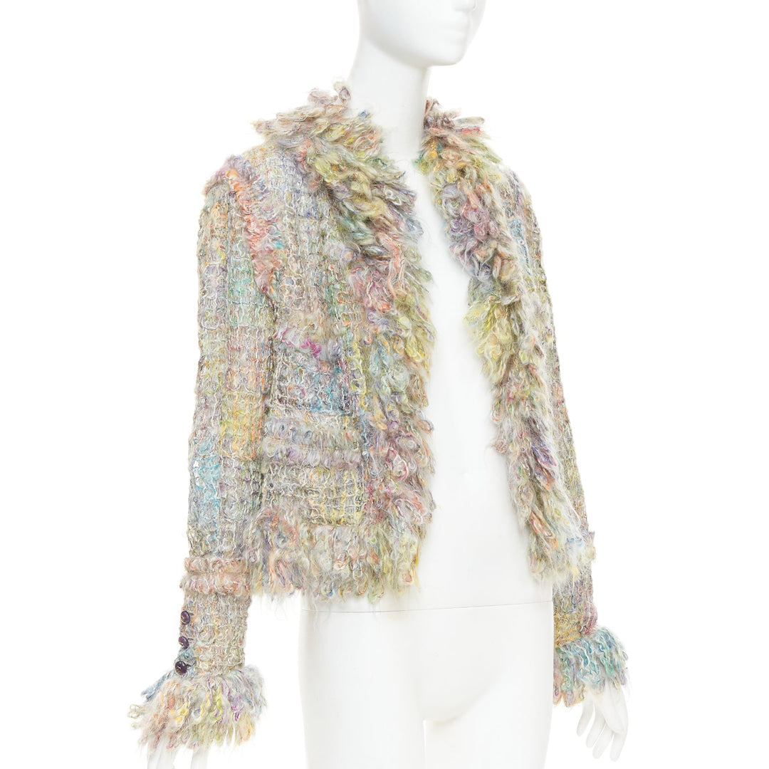Extra Details: Chanel multicoloured mohair jacket, designed by Karl Lagerfeld for the Fall-Winter 2003 collection. Crafted from a lattice of mohair and net-lace in pastel shades of green, pink, orange, blue, and yellow, it features lopped fringed trim on the collar, cuffs. The jacket is designed with an open front and has no closure, offering a distinctive and elegant silhouette.