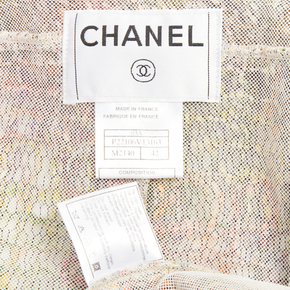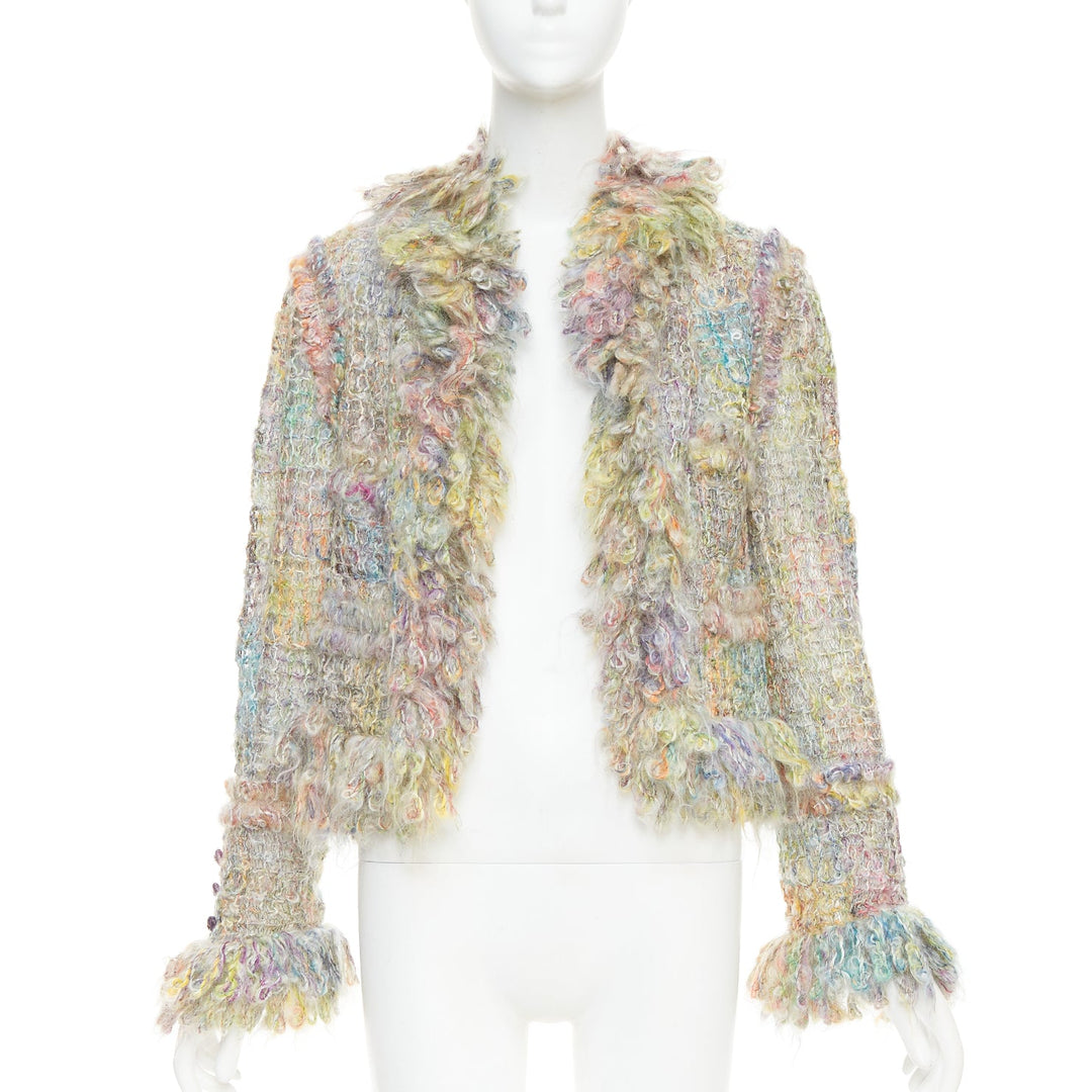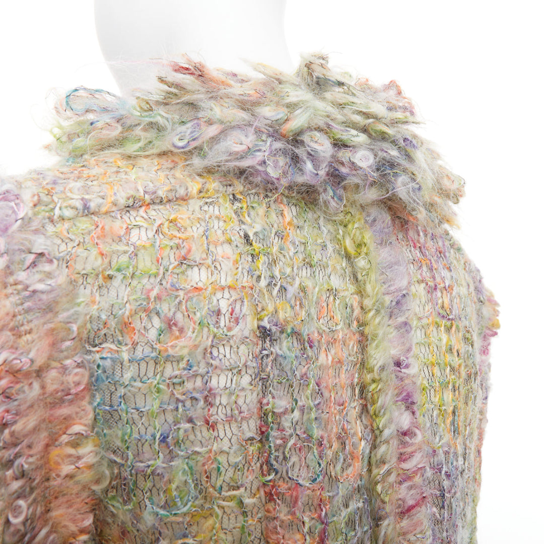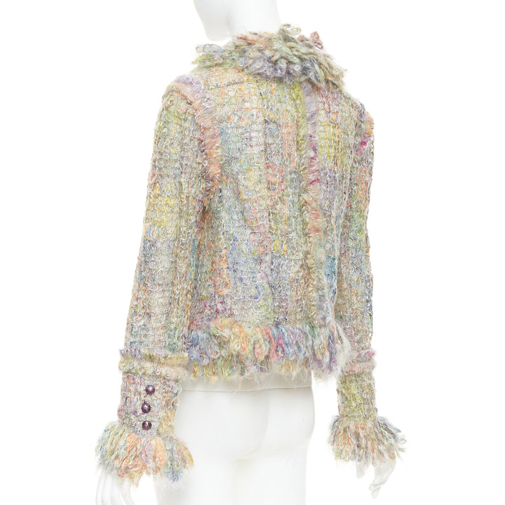 Extra Details: Chanel multicoloured mohair jacket, designed by Karl Lagerfeld for the Fall-Winter 2003 collection. Crafted from a lattice of mohair and net-lace in pastel shades of green, pink, orange, blue, and yellow, it features lopped fringed trim on the collar, cuffs. The jacket is designed with an open front and has no closure, offering a distinctive and elegant silhouette.