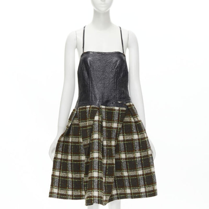 JUNYA WATANABE 2005 black lacquered bust green tweed flared cocktail dress M