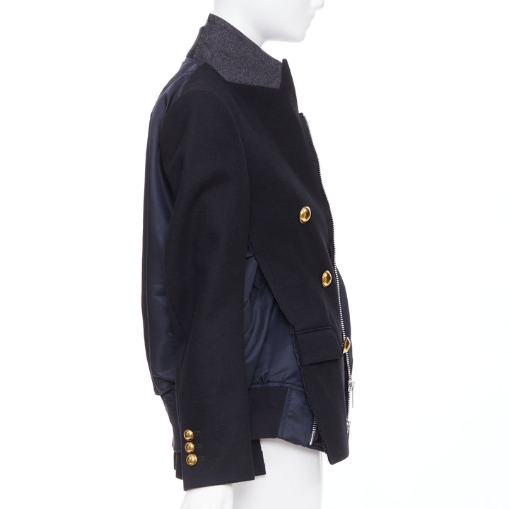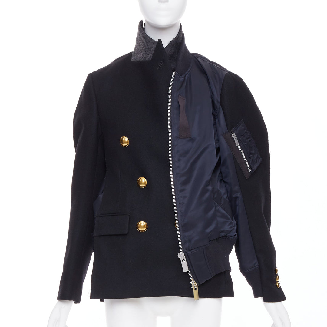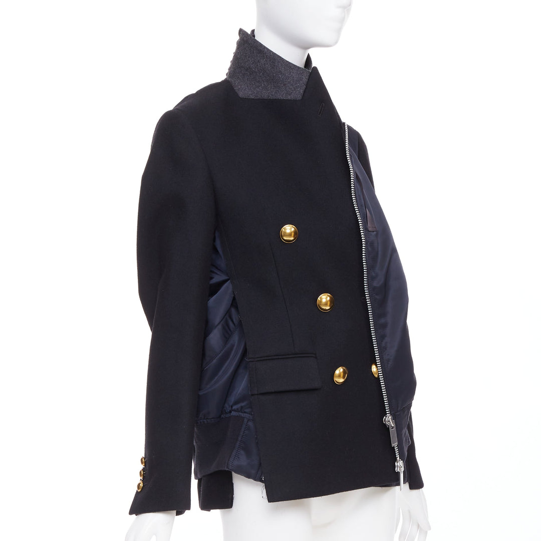 Extra Details: From the runway collection: Sacai's mixes a felted wool double breasted jacket with a quilted bomber, resulting in this jacket's avant-garde look. This hybrid piece has a grey standing collar, and is detailed with oversized gold buttons in front at at the cuffs, along with exposed zipper closures in front and at the sleeve. Side pockets, side hem vent, and ribbed back hem.