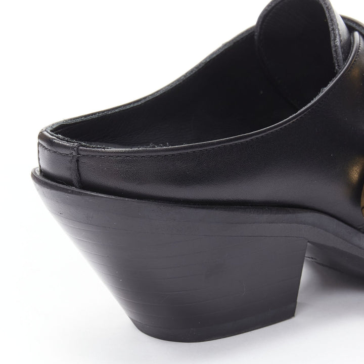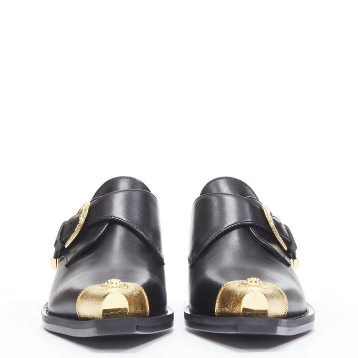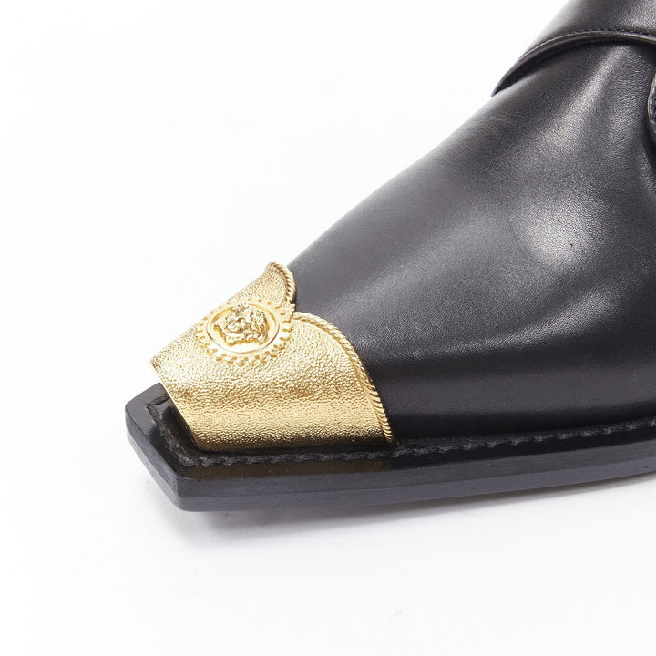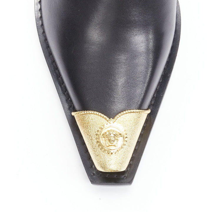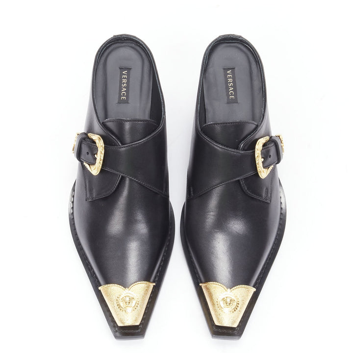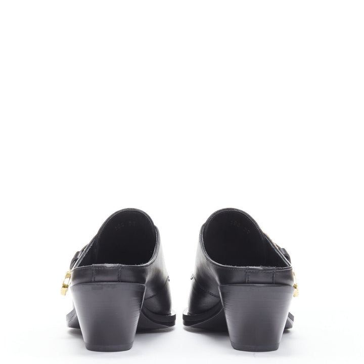 VERSACE 2019 black leather gold Medusa toe western buckle cuban mule EU37