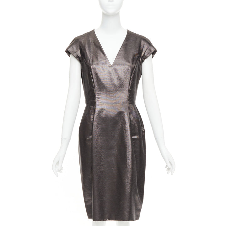 YVES SAINT LAURENT 2009 bronze metallic look V neck sheath dress FR40 S