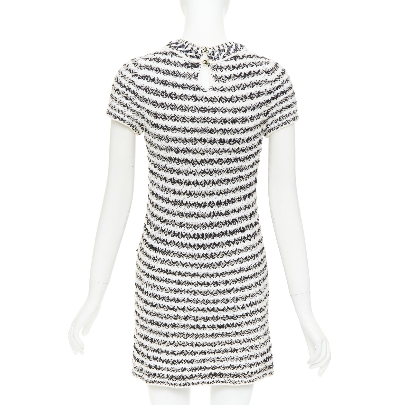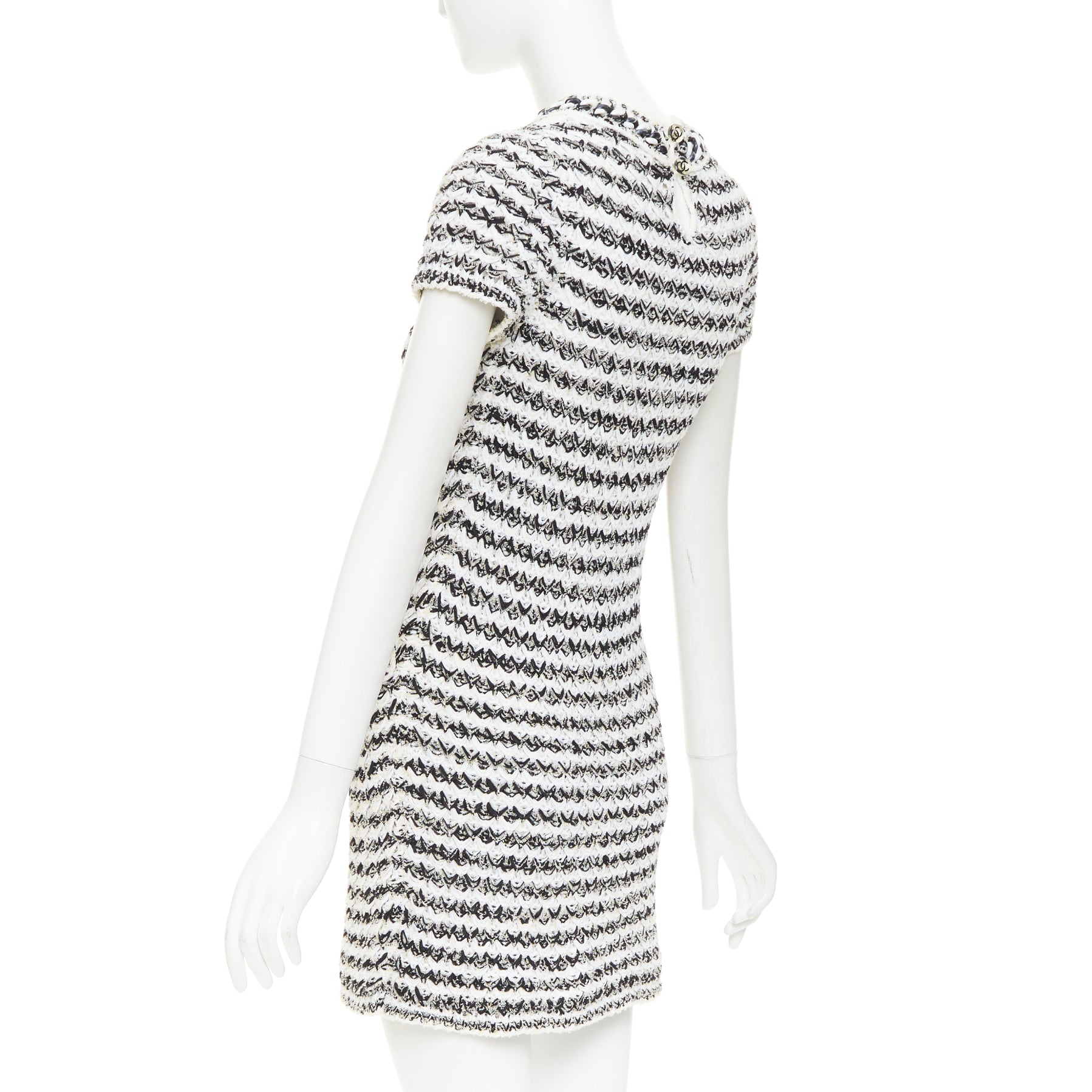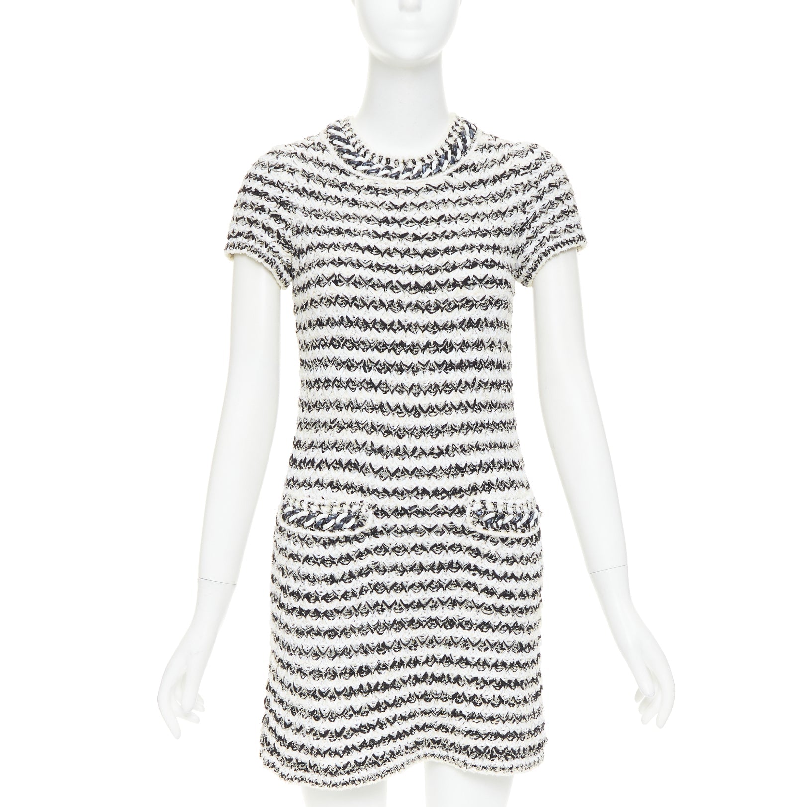 Extra Details: The dress is crafted in a black and white variegated, textured knit and features a crew neckline and two patch pockets on the front. The contrast trim around the neck, sleeves, and pockets often has chain detailing and the signature CC logo on the buttons at keyhole back.