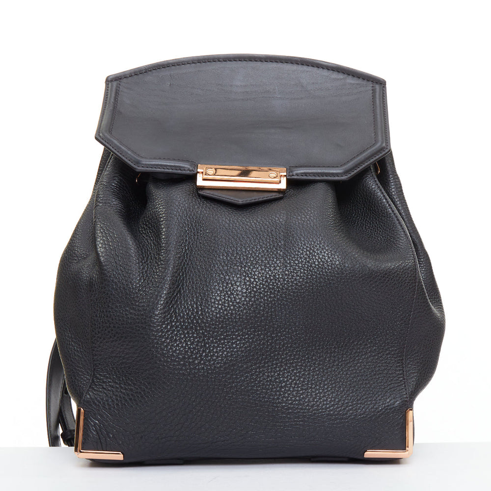 Extra Details: Alexander Wang Backpack in black leather with rose gold-tone hardware. Features a rolled handle, dual adjustable shoulder straps, and a single exterior pocket. Includes nylon lining and a single interior pocket. Secured with a drawstring closure at the top and a push-lock closure at the front. Protective feet at the base for added durability.