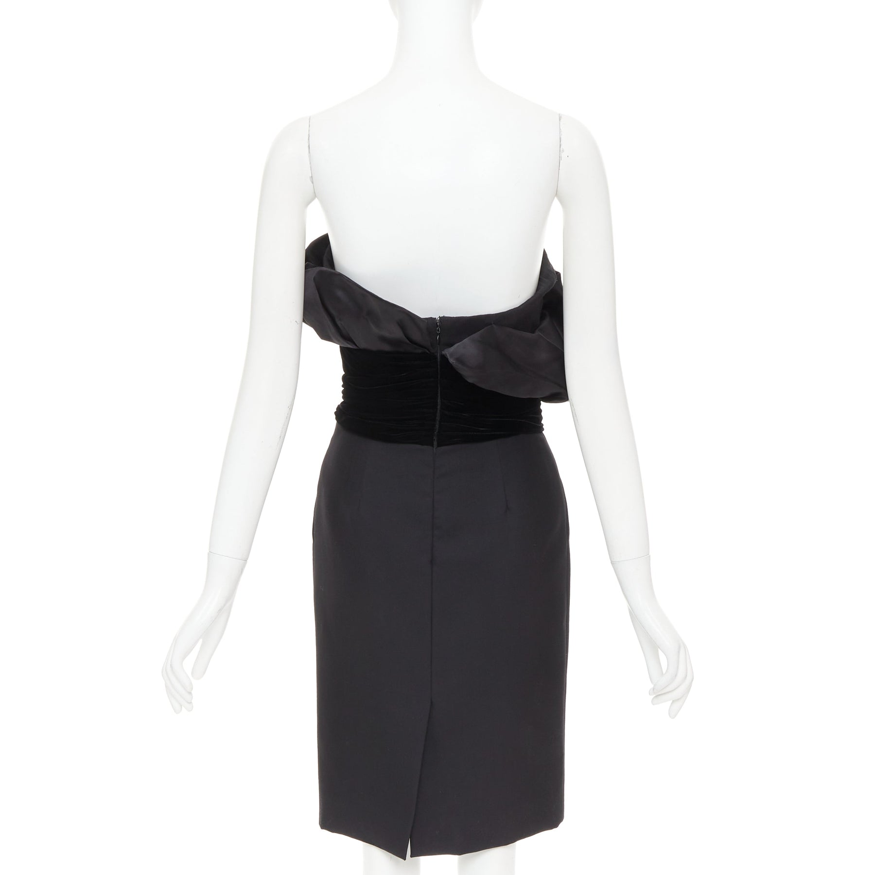 Extra Details: The dress features a black satin strapless bodice with a boned corset. Contrasting black velvet waist belt. It embodies the glamorous look popular in 1980s fashion.
